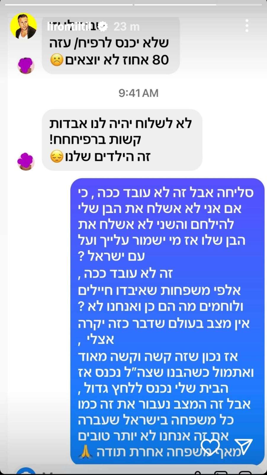 "שבור לו יד, שלא ייכנס לרפיח/עזה", כתבה לו. "80% (הכוונה לחיילים, הטעות במקור, ע"ח) לא יוצאים. לא לשלוח. יהיו לנו אבידות קשות ברפיח, זה הילדים שלנו".