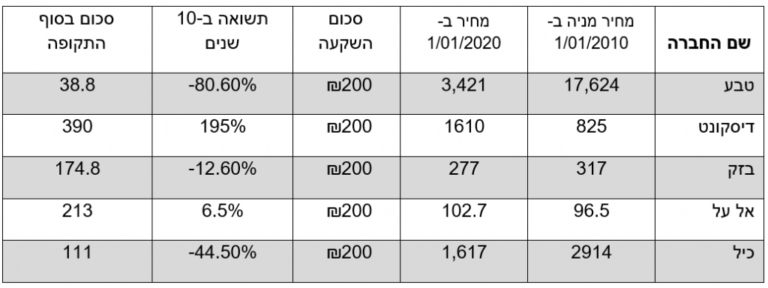 ניתן לראות על פי נתוני הטבלה איך סכום השקעה של 1,000 שקל הפך לסכום של 927.6 שקל בלבד. כלומר, השקעה ב-5 מניות בשוק ההון ל-10 שנים הביאה אותנו להפסד של 7.3%!