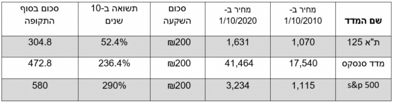 להלן שתי טבלאות, הראשונה מאפשרת לך לראות את התשואה של 5 מניות פופולריות בשוק הישראלי בטווח של 10 שנים. השנייה מראה לך את התשואה של 3 מדדים בשווקים בעולם.