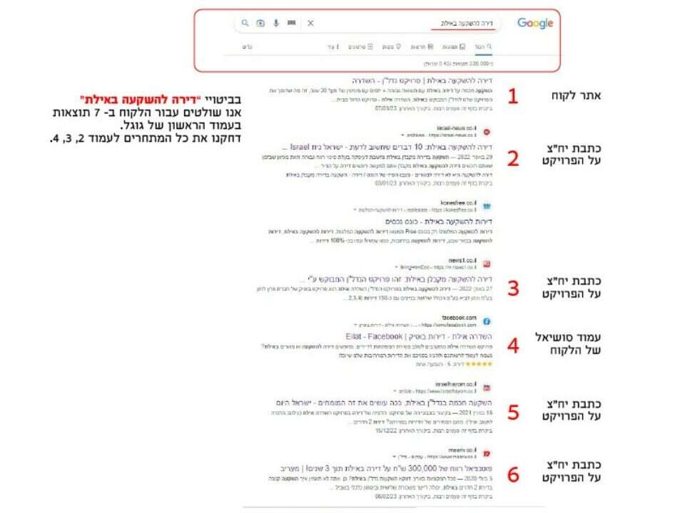 בטח, אחת החברות שאני מקדם היא חברת יזמים גדולים של נדל”ן, לפני שלוש שנים הלקוחות שלי החלו בבניה של פרויקט נדל”ן באילת הכולל מעל 150 יחידות דיור. פרויקט בסדר גודל כזה מצריך תקציב עצום והמון עבודה על קידום ממומן ואורגני בגוגל. הפרוייקט נקרא ״השדרה״ והוא יופיע לכל אדם המחפש את הביטוי ״דירה להשקעה באילת״ בעמוד הראשון, תחת 7 תוצאות (מתוך 10 תוצאות סה״כ)