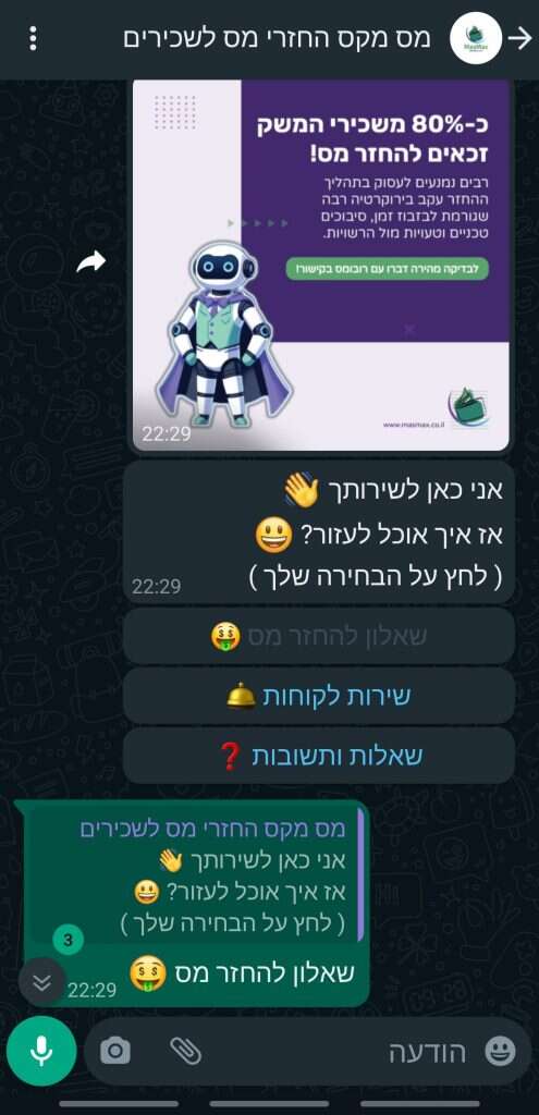 מה כולל ההליך של חברת מס מקס?החברה מציעה תהליך דיגיטלי ופשוט להחזר המס, באמצעות צ’אט-בוט חכם בוואטסאפ.