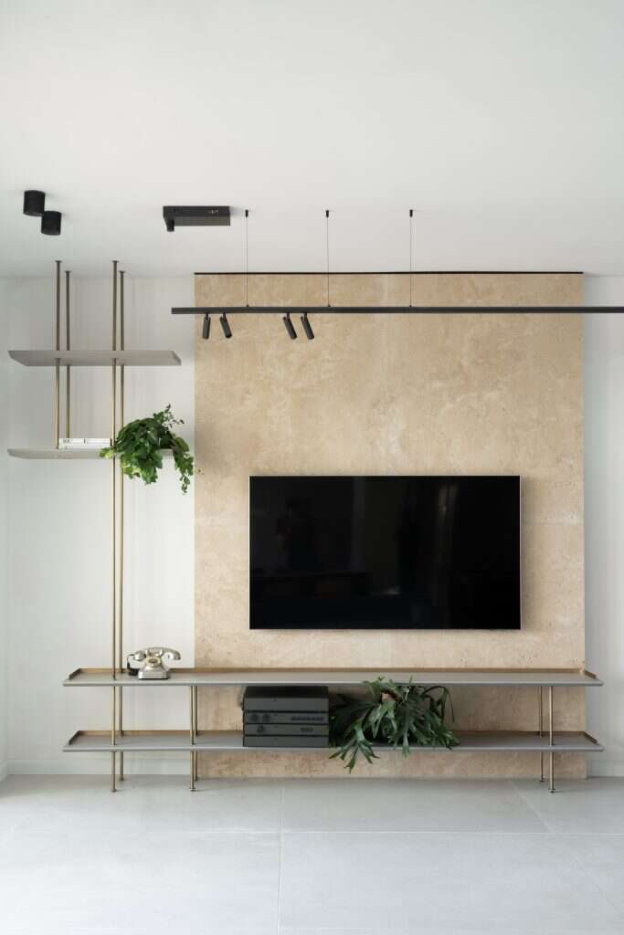 הפתרון שכהן מצא עבורו היה ייחודי ומרגש כאחד. הוא דגם אבן ייחודית ששימשה כחלק משמעותי בעיצוב הוילה הפרטית, כחפץ מעבר. בדירה החדשה הותקנה אותה אבן איטלקית בעיבוד ייחודי, חלק מהתהליך שעברה האבן, עבר גם הדייר: החציבה מההר באיטליה, העיבוד, השילוח, ועד ההתקנה המדויקת בדירתו החדשה בתל אביב. בעזרת תאורה חכמה ומדפים המשלבים עץ ומתכת, הצליח איתן כהן ליצור מעין פינה מודרנית, שמחזירה את הלקוח אל הבית ממנו עבר בכל פעם שהוא נכנס הביתה.