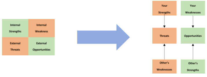במודל החדש שני שינויים מרכזיים מהמודל הקלאסי: הסתכלות על חוזקות וחולשות של המתחרים, והסתכלות על חולשות כהזדמנויות, ועל חוזקות כאיומים.