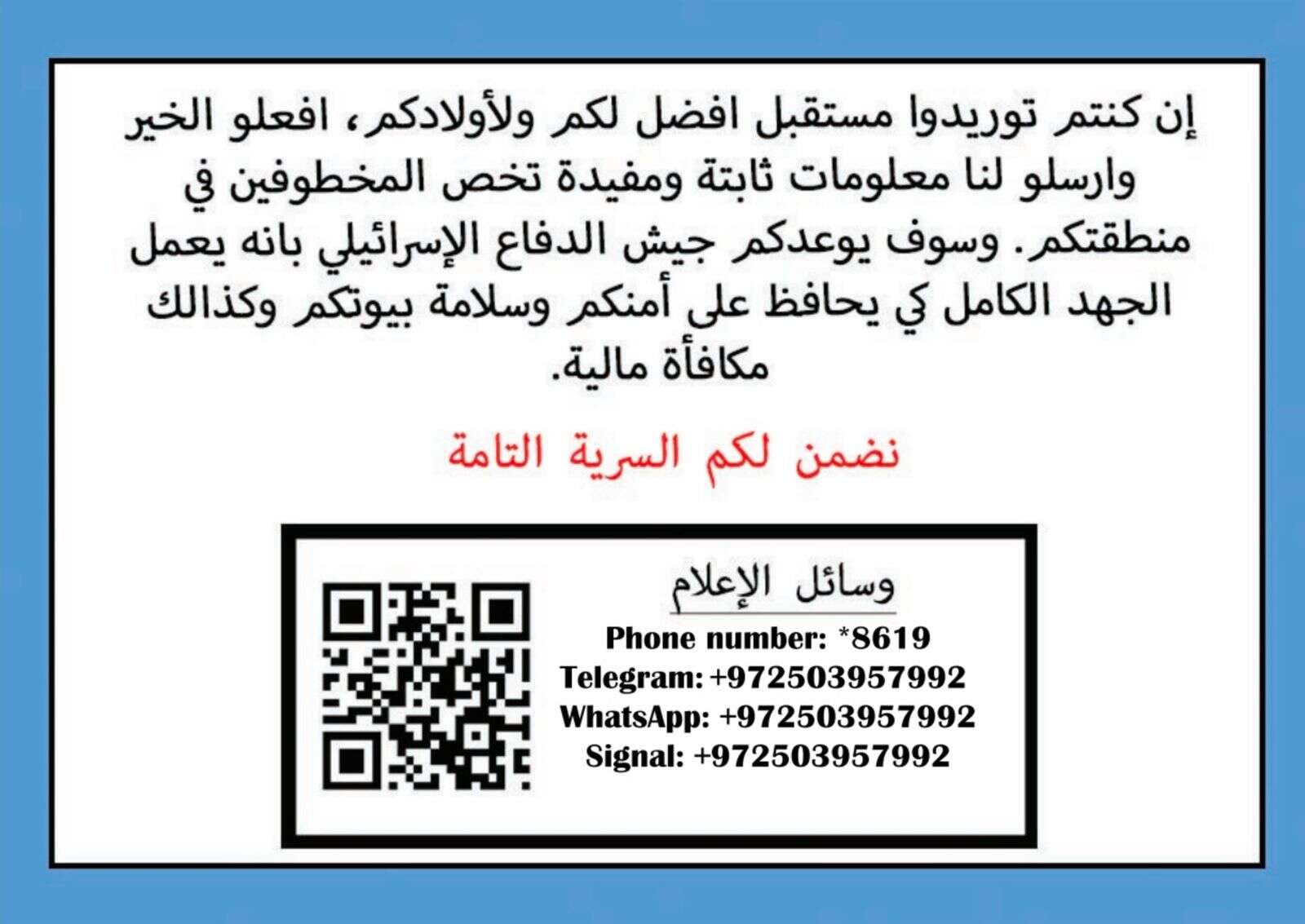 בשעות האחרונות (שלישי) צה״ל פנה במגוון כלים לתושבי רצועת עזה על מנת שיחשפו מידע מבוסס ומועיל אודות החטופים, ובכך יזכו בביטחון ותגמול.