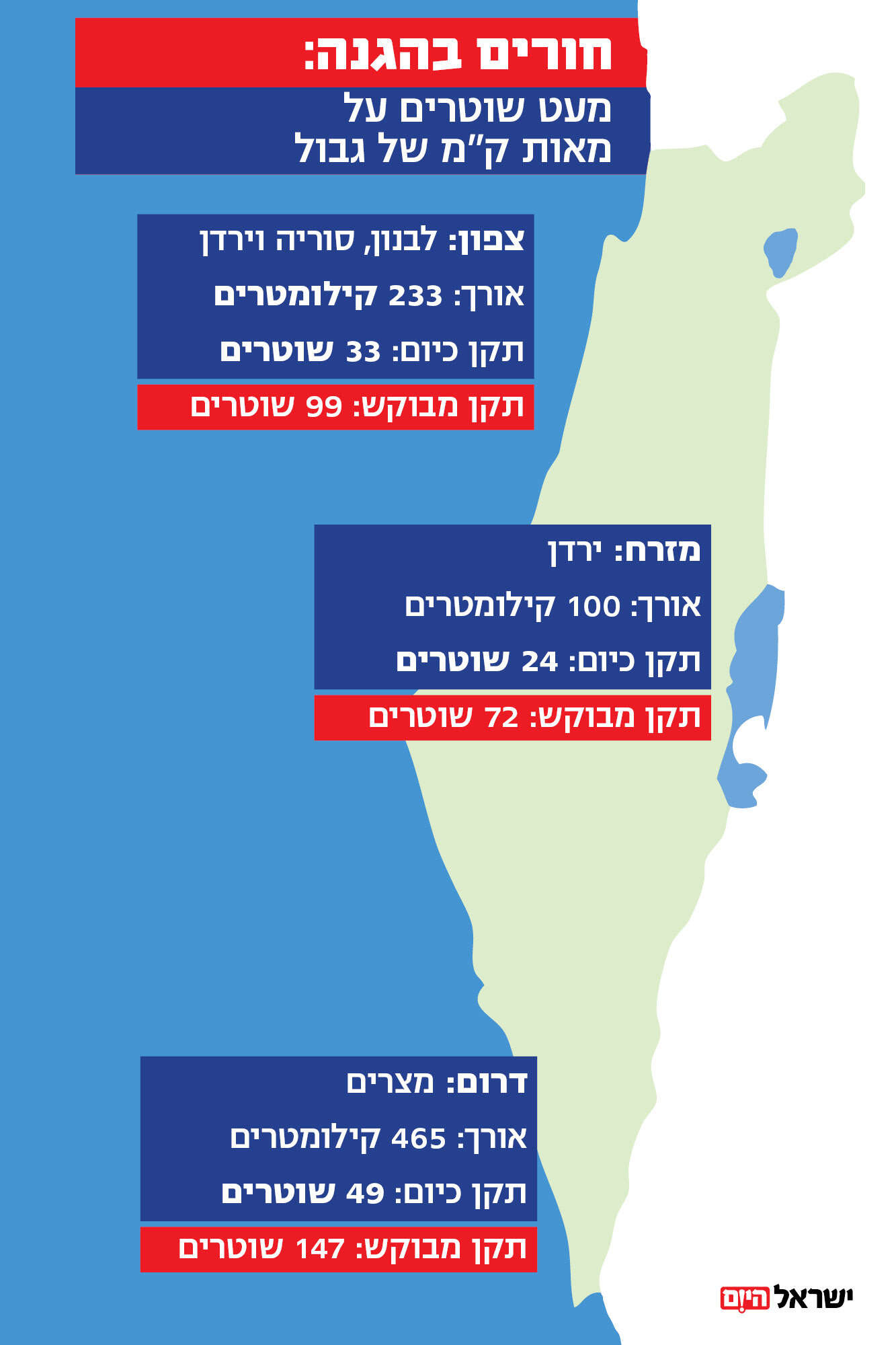 מנתונים שהגיעו ל"ישראל היום" עולה, כי התקן של יחידת יג"ל בצפון, החולשת על גבול לבנון, סוריה וירדן שאורכו 233 קילומטר, עומד כיום על 33 שוטרים. התקן של יחידת יג"ל שבמחוז ש"י, החולשת על גבול ירדן שאורכו 100 ק"מ, עומד על 24 שוטרים. התקן של יחידת מג"ן בגבול ישראל־מצרים, שאורכו 465 ק"מ, עומד על 49 שוטרים.