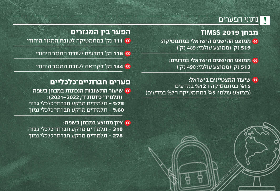 מצד אחד - ציונים גבוהים מהממוצע העולמי במתמטיקה ובמדעים (SSMIT 9102). מנגד - דשדוש מאחור בקריאה, במתמטיקה ובמדעים (8102 ASIP). בישראל יש שיעור אדיר של תלמידים מצטיינים, אך פער הציונים בין תלמידים חזקים לחלשים הוא הגבוה ביותר בעולם.