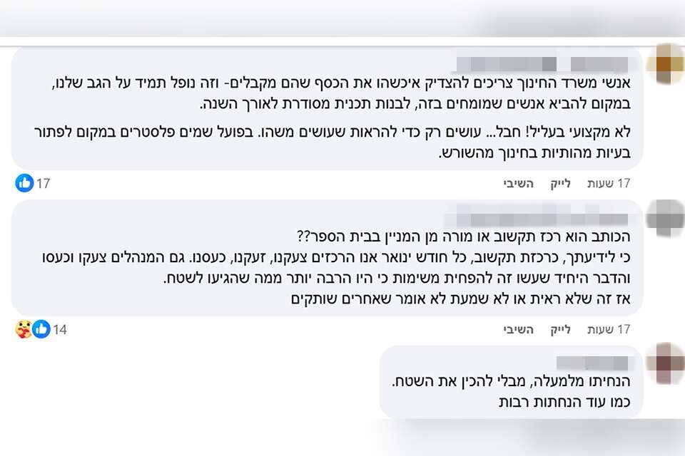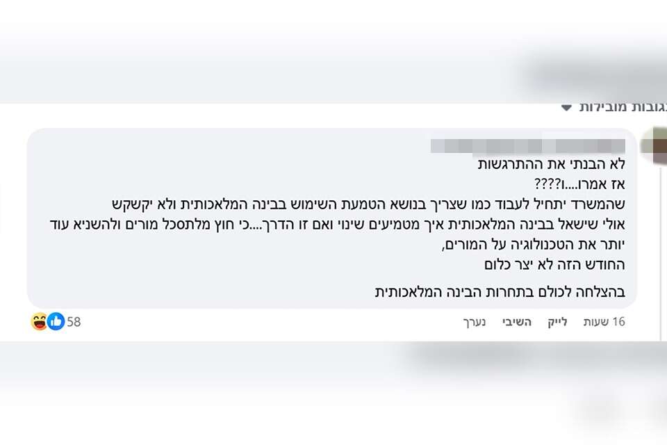 עובדת נוספת כתבה: "עובדי משרד החינוך צריכים להצדיק את המשכורות שלהם, אז הם מטילים עלינו עוד ועוד משימות במקום לחשוב על פתרונות אמיתיים לבעיות בחינוך. זה לא מקצועי בכלל. במקום לטפל בשורש הבעיה, הם רק מכסים עליה. לא מקצועי בעליל! חבל... עושים רק כדי להראות שעושים משהו. בפועל שמים פלסטרים במקום לפתור בעיות מהותיות בחינוך מהשורש". מורה אחרת הוסיפה: "הנחיתו מלמעלה, מבלי להכין את השטח. כמו עוד הנחתות רבות".
