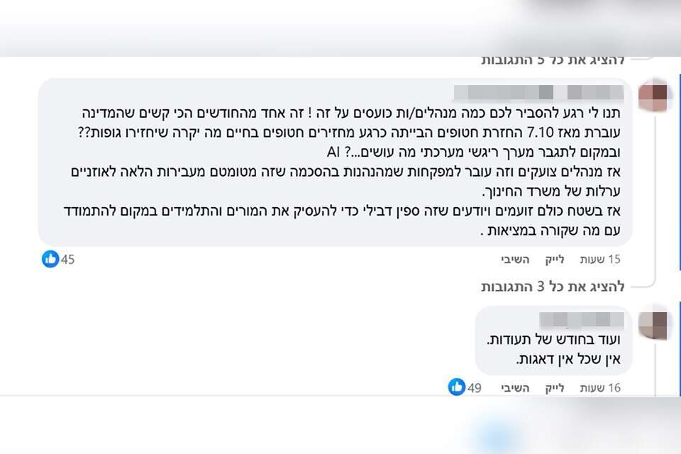 הזעם התפוצץ בקבוצות רבות של מורים ברשתות החברתיות. "בשטח כולם זועמים ויודעים שזה ספין דבילי כדי להעסיק את המורים והתלמידים במקום להתמודד עם מה שקורה במציאות". כתבה אשת חינוך: ""תנו לי להסביר לכם כמה מנהלים/ות כועסים על זה! זה אחד מהחודשים הכי קשים שהמדינה עוברת מאז 7.10 ובמקום לתגבר מערך ריגשי מערכתי מה עושים...? AI?. אז מנהלים צועקים וזה עובר למפקחות שמהנהנות בהסכמה שזה מטומטם מעבירות הלאה לאוזניים ערלות של משרד החינוך".