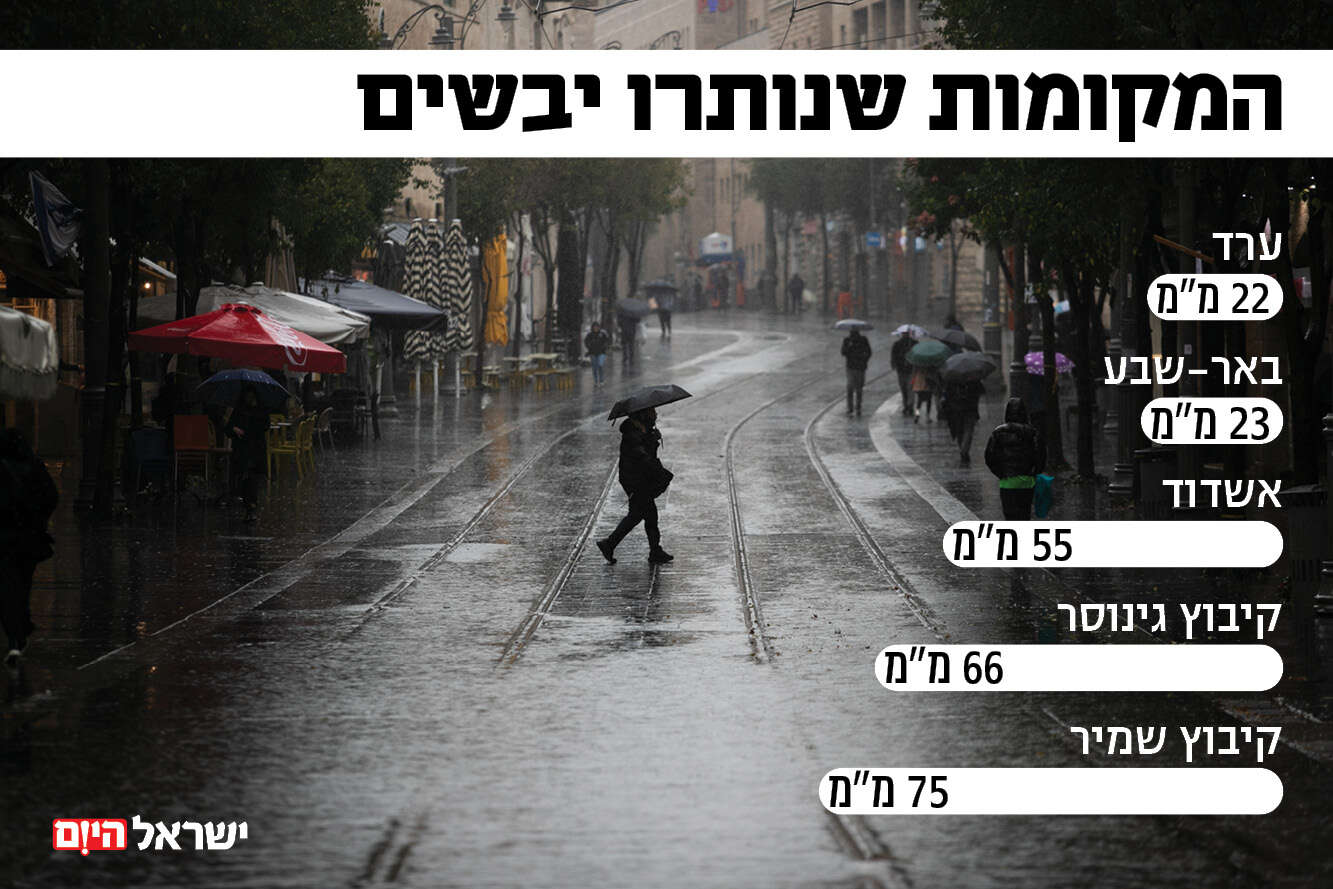 מערכת הגשם שחלה בימים האחרונים הובילה לירידת משקעים משמעותית בחלקים נרחבים בארץ. על פי תחנות חברת החיזוי "מטאו טק", מיום שני ועד שבת 18:00 הערים שבהם נרשמו שיא הממטרים היו מג'דל שמס עם 128 מ"מ, נתניה עם 110 מ"מ, ירושלים עם 104 מ"מ, כפר סבא עם 101 מ"מ, קיבוץ אלרום עם 98 מ"מ, ראשון לציון עם 93 מ"מ, רמת הנדיב עם 91 מ"מ ותל אביב עם 89 מ"מ. מן הצד השני, באשדוד נרשמו 55 מ"מ גשם, בבאר שבע נרשמו 23 מ"מ ואילו בערד ירדו 22 מ"מ.