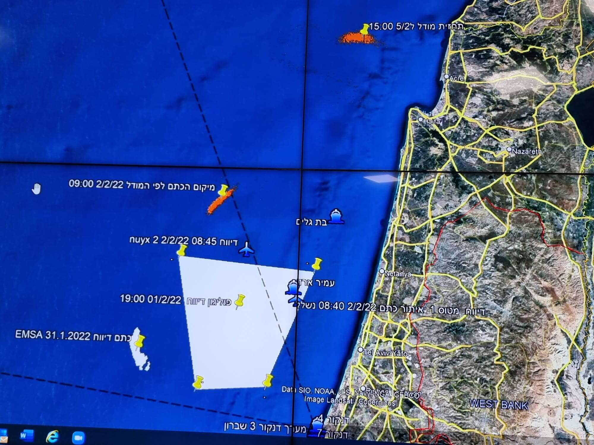 בשלב זה, עורכים מטוס סיור של צה"ל וכלי שיט, וכן אוניית הבת גלים של המשרד להגנת הסביבה, משרד האנרגיה וחיא"ל, סיורים מול חופי ישראל לאיתור הכתם החשוד. נכון לשעה זו, לא איתרו כלי השיט אינדיקציה לדלק או זיהום ים אחר. בחיפה נפתח חדר מצב מיוחד, ומשם ינוהל וירוכז האירוע והטיפול בו על ידי רני עמיר, מנהל היחידה הארצית להגנת הסביבה הימית של המשרד להגנת הסביבה.