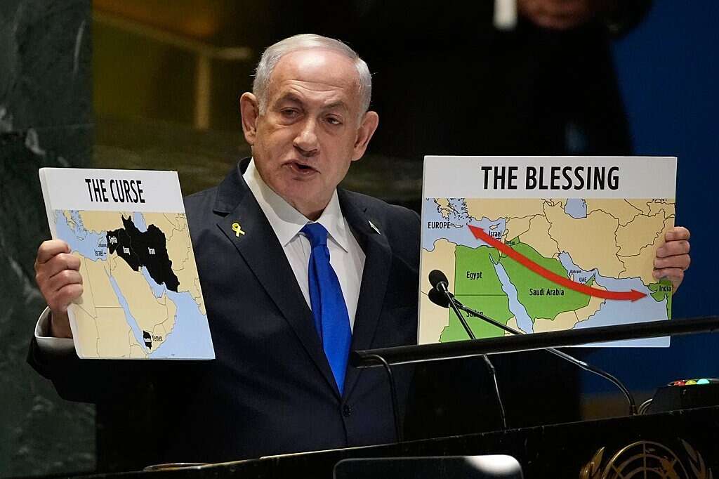ראש הממשלה הציג שתי מפות: "זו המפה שהצגתי לכם שנה שעברה, מפת הברכה, שבה אפשר לראות איך מחברים את... שהיו משרתים את טובת 2 מיליארד אנשים. תראו את מפת הקללה - שאיראן ייצרה. איראן רוצה להפיץ את הרדיקליזם שלה מעבר למזרח התיכון. בשביל זה היא בנתה טילים בליסטיים לנשק גרעיני".