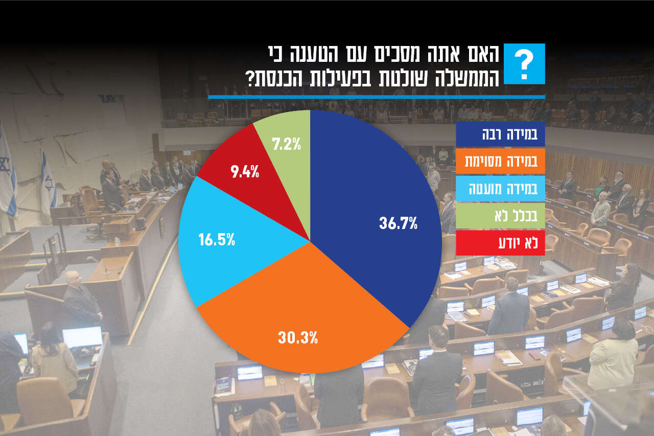הנתונים מצביעים גם על תחושת חוסר עצמאות של הכנסת, ו־67% מהנשאלים סבורים שהממשלה שולטת בפעילות בית המחוקקים. בקרב מצביעי האופוזיציה, 82% מחזיקים בדעה זו, ואפילו בקרב מצביעי הקואליציה כמעט מחצית (49%) מסכימים עם הטענה.