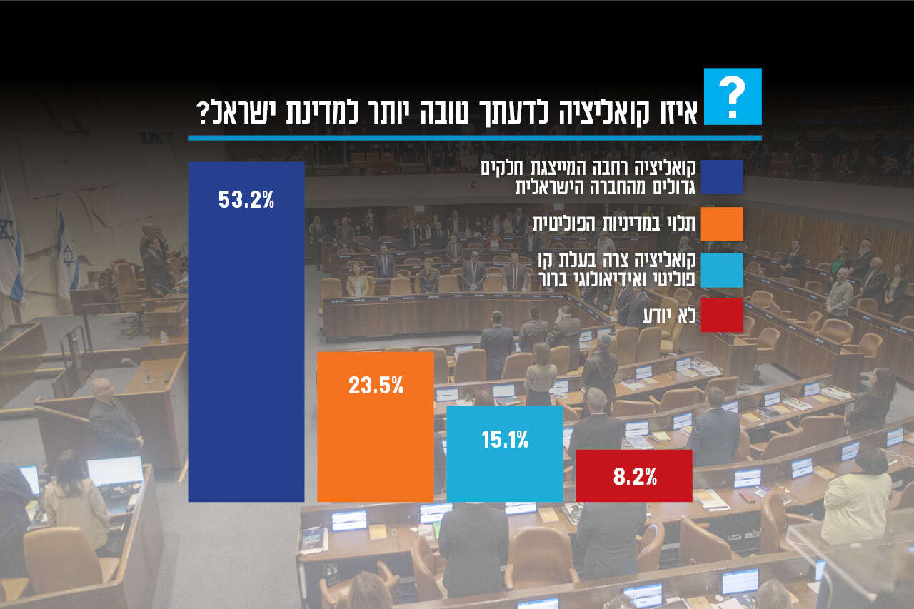על רקע המשבר העמוק, ניכרת כמיהה ציבורית לאחדות ולשיתוף פעולה. 73% מהנשאלים תומכים בשיתוף פעולה בין הקואליציה לאופוזיציה, והתמיכה גבוהה במיוחד (כ־80%) בקרב המסורתיים, הדתיים והחילונים. יתרה מכך, 53% מעדיפים קואליציה רחבה המייצגת חלקים גדולים מהחברה הישראלית.