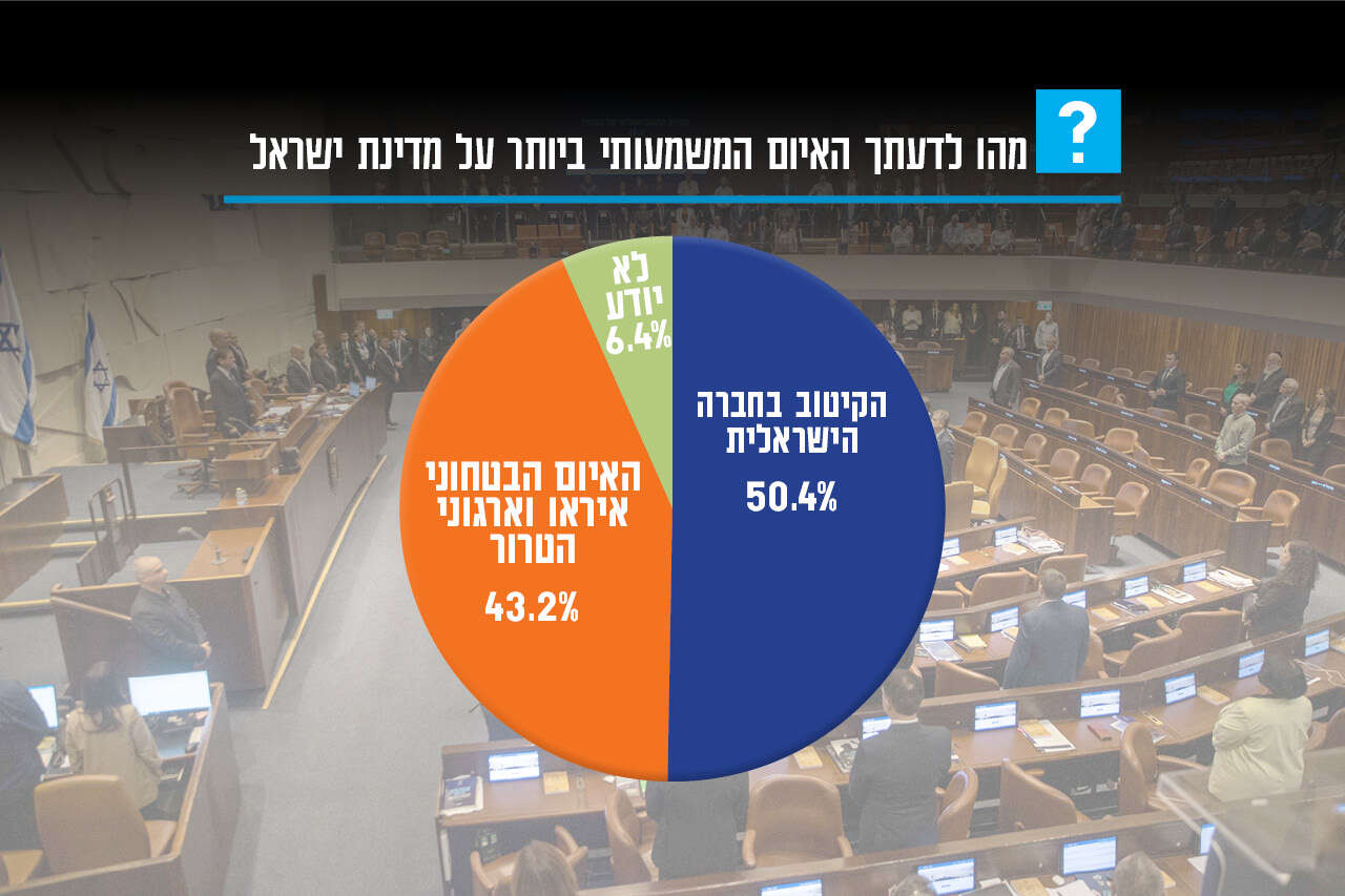 נוסף על כך, הסקר חושף גם פער דרמטי בתפיסת האיומים על המדינה: בעוד 65% ממצביעי הקואליציה רואים באיום הביטחוני את הסכנה המרכזית, 63% ממצביעי האופוזיציה מצביעים על הקיטוב החברתי כאיום המשמעותי ביותר - נתון המשקף את עומק השסע בחברה הישראלית.