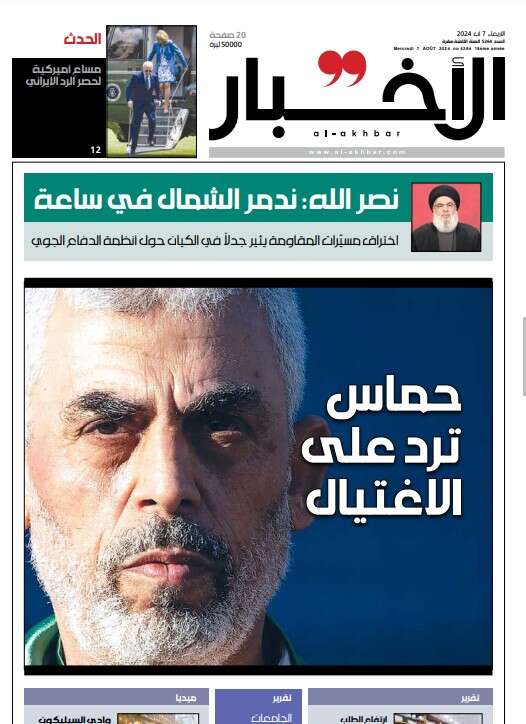 בשער העיתון "אל-אחבאר", המקורב לחיזבאללה, הקדישו את הכותרת הראשית לבחירתו של סינוואר: "חמאס מגיב לחיסולים".