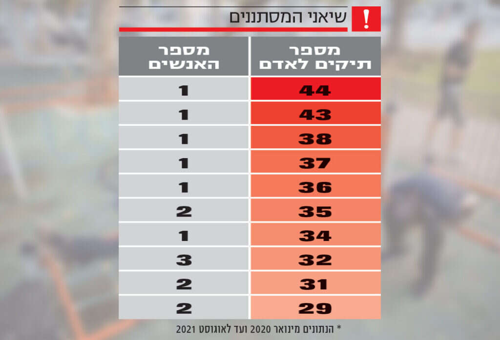 שיא התיקים למסתנן בודד, כאמור, עומד על 44 תיקים, אך מהנתונים עולה ממצא מדאיג, ולפיו בחודשים הללו נפתחו בין 30 ל־43 תיקים פליליים נגד 12 מסתננים (כל אחד).