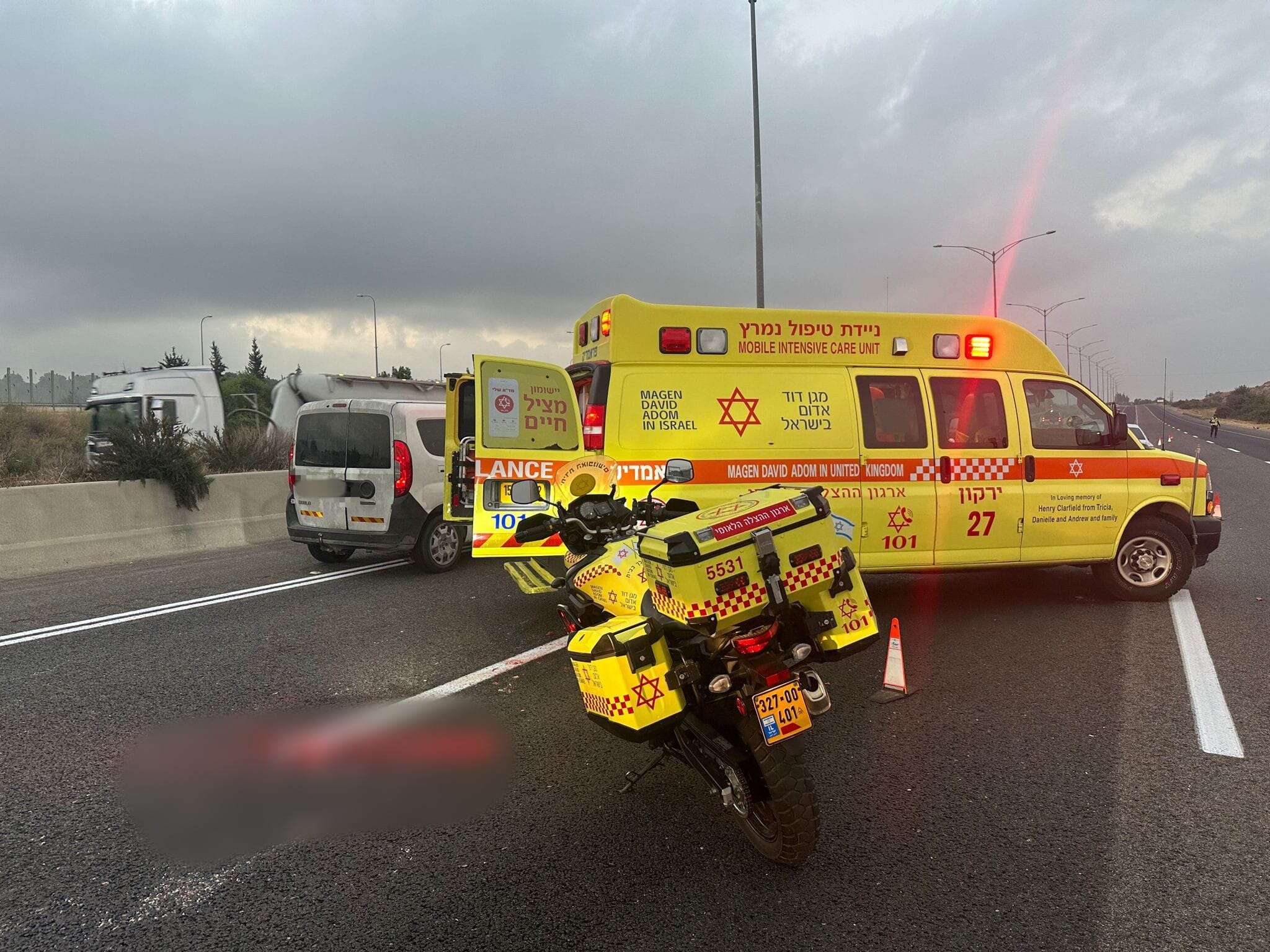 פרמדיקית מד"א, מרלן ברינצקי, וחובש בכיר ביחידת האופנועים של מד"א, חזי גוטמן, סיפרו: "כשהגענו למקום ראינו גבר כבן 40 שוכב על הכביש מחוסר הכרה עם חבלה רב מערכתית קשה. הענקנו לו טיפול רפואי ופיננו בדחיפות לבית החולים כשמצבו אנוש".