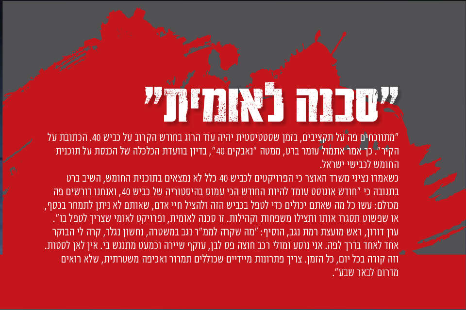 "בחצי השנה האחרונה ספרנו ארבעה הרוגים, אבל גם אם לא הייתי משתולל כביש 40 היה מוגדר כביש אדום. אנחנו הרי מבקשים את השיפוץ כבר שנים. פחדנו שהמדינה תבחר להשקיע בדברים אחרים, אבל האירועים האחרונים הצליחו להשפיע והובילו לכך שהנהלת משרד התחבורה, השרה מירי רגב, וגם נתיבי ישראל, הבינו שהם צריכים להיכנס למרוץ הזה איתנו כדי למנוע את התאונה הבאה".
