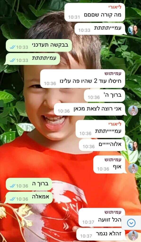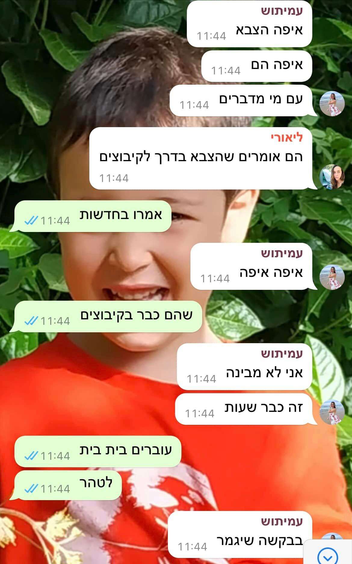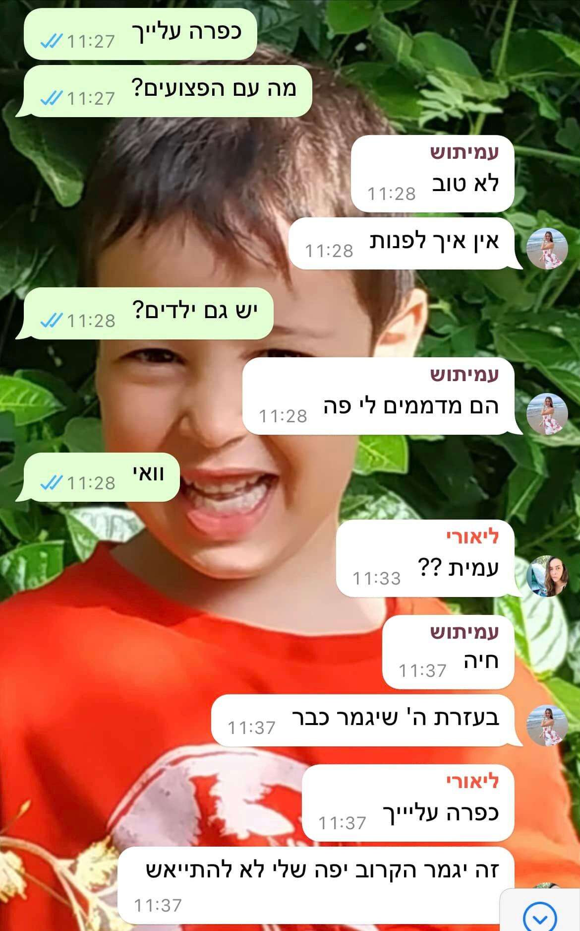 "מעדכנת: אין חדש מעמית. היא לא היתה בין בני הערובה בקיבוץ. אנחנו עדיין לא יודעים איפה היא ומה איתה. אף גורם רשמי לא דיבר איתנו ולו פעם אחת כדי לעדכן במשהו או אפילו להגיד שמנסים לחפש אותה. פעם אחרונה שדיברתי איתה היתה במרפאה בבארי. ירויה.