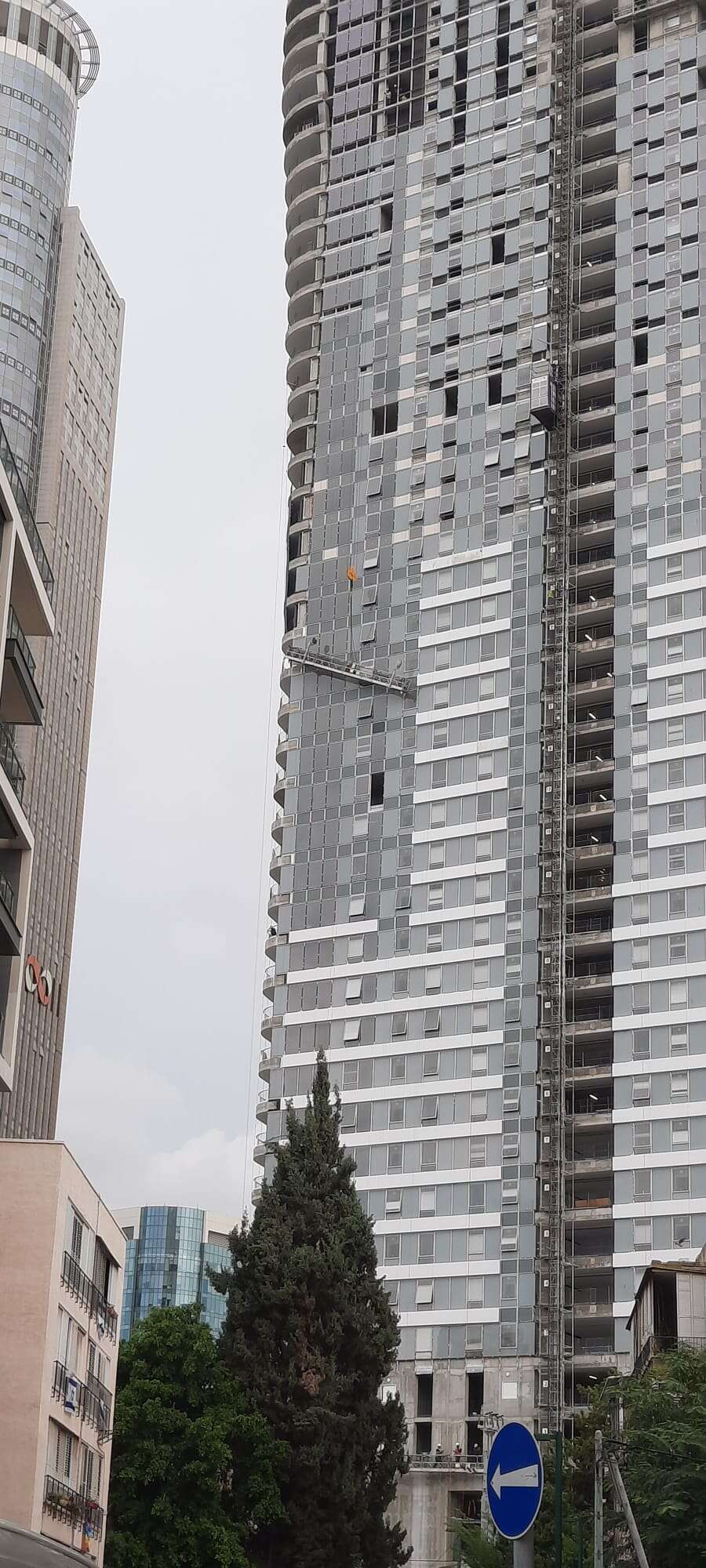 בין שמיים לארץ. פועל הבניין מחוץ לגורד השחקים, הבוקר // צילום: דוברות כיבוי אש
