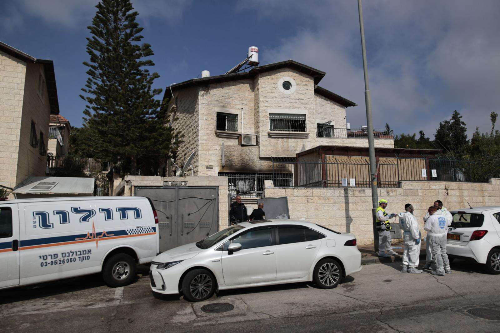 שוטרים וחוקר דליקות של כב"ה פועלים בזירת המבנה השרוף בפסגת זאב // דוברות המשטרה
