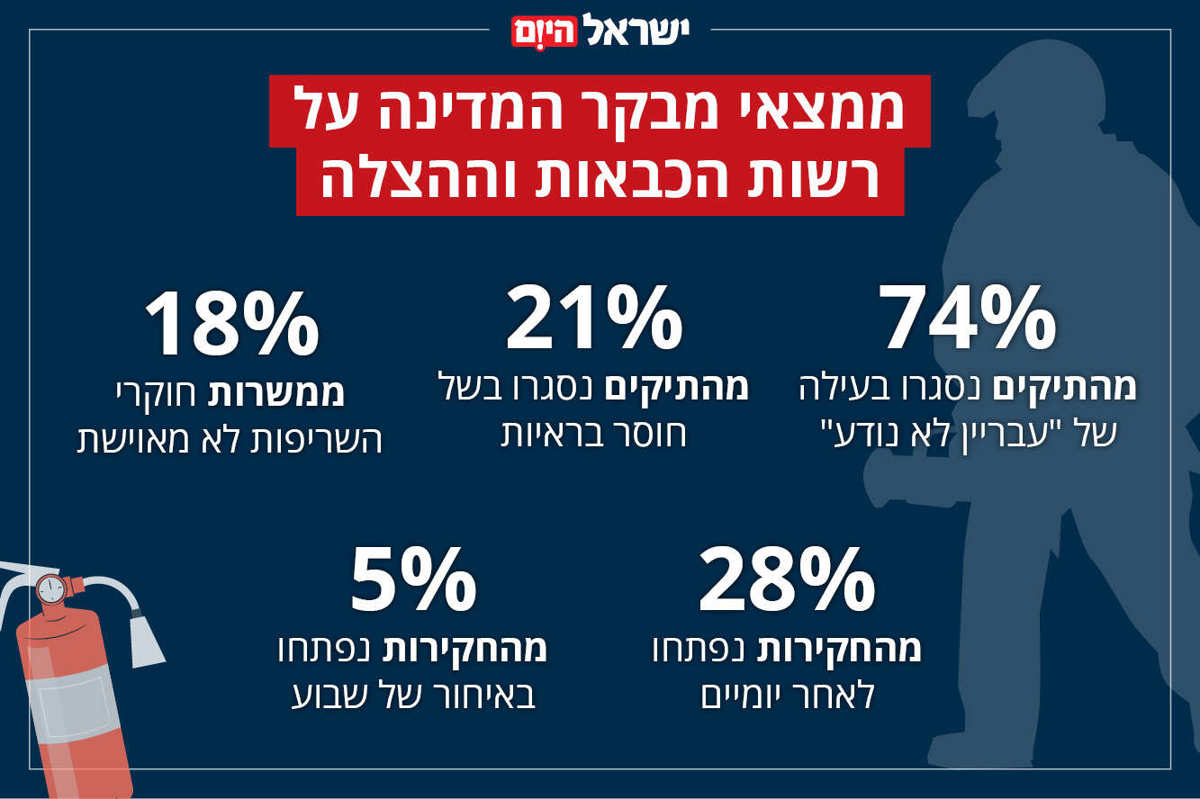 מבקר המדינה קובע כי הרשות הארצית לכבאות והצלה אינה ערוכה לבצע חקירות של שריפות בהיקף מלא כנדרש על פי החוק, ובפועל מאז הקמת מערך החקירות ברשות בשנת 2012 נחקרו בממוצע רב-שנתי כ-10% מאירועי הדליקה שטופלו על ידי צוותי הכיבוי. כל זאת מבלי שהתקיים תהליך קבלת החלטות סדור ועל ידי הגורמים שהוסמכו לכך בתקנות, בדבר אי קיום חקירה בכ-90% מאירועי הדליקה.