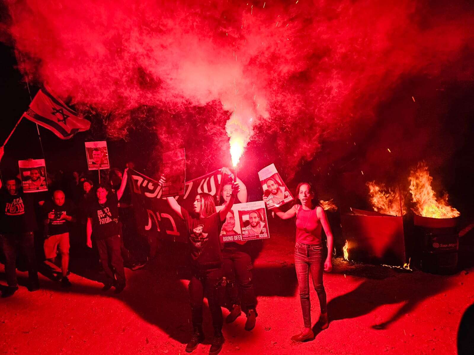 משפחות חטופים ליד ביתו של נתניהו בקיסריה הדליקו כעת מדורות: ״אין בית עד שהחטופים יחזרו"