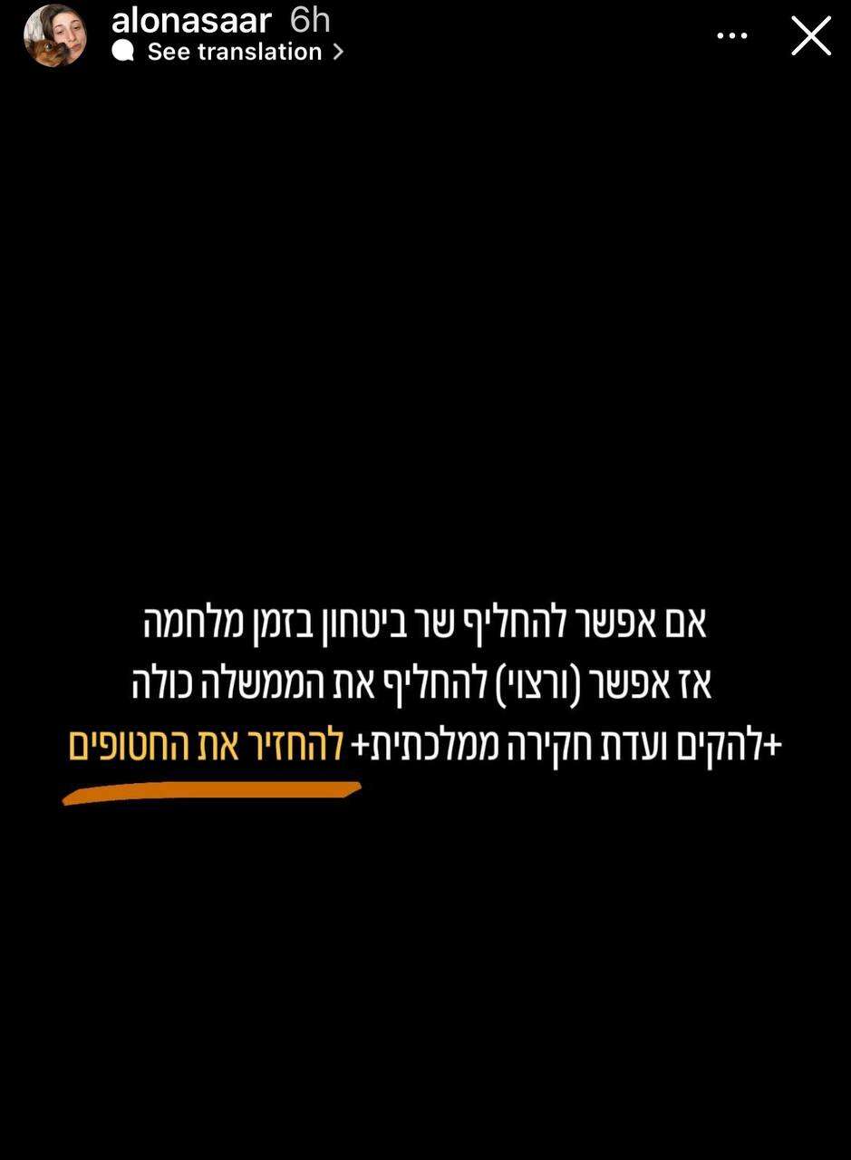 גם בתו של השר גדעון סער, השחקנית, אלונה סער, הצטרפה למחאה נגד פיטורי גלנט וכתבה באינסטגרם: "אם אפשר להחליף שר ביטחון בזמן מלחמה אז אפשר (ורצוי) להחליף את הממשלה כולה + להקים ועדת חקירה ממלכתית + להחזיר את החטופים".
