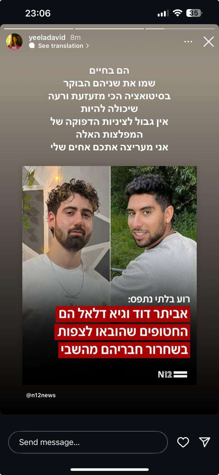 דלאל הוסיף: "גיא יותר רזה, העיניים שלו מבוהלות אבל זה גיא, הקול והתנועות שלו כמו גיא. אם הייתי יכול ללכת לחבק אותו, הייתי רץ לעזה כדי לחבק אותו, שפשוט יוציאו אותו משם." הוא המשיך: "אני מניח שחמאס אמר להם מה להגיד, הם לא חשופים לתקשורת, אני לא מתייחס לתוכן כי זה לא רלוונטי, מה שמעניין זה תנועת הגוף שלהם, שהם לא פצועים, רזים יחסית ועוברים התעללות פסיכולוגית קשה מאוד. בדיוק היום קיבלנו אות חיים ממנו, לא שמענו כלום על התנאים, אבל רואים עכשיו שהתנאים שלהם היו פחות קשים משל אחרים ואני שמח על זה. אני רק מקווה שלא יצטרכו להשאר שם עוד הרבה זמן. הגיע הזמן להוציא אותם החוצה".