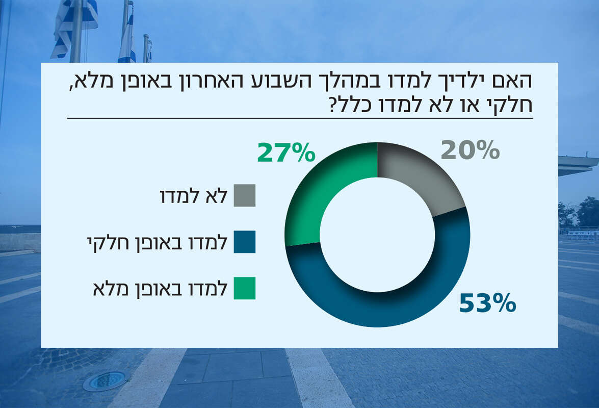כשליש מהישראלים העובדים (32%) מעידים כי החסירו ימי עבודה בשבוע האחרון, ורק כשליש מהישראלים (27%) מעידים שילדיהם לומדים בשבוע האחרון בבתי הספר. היתר מעידים כי ילדיהם לא למדו כלל (20%) או למדו רק באופן חלקי (53%), כך עולה מסקר "ישראל היום", שנערך השבוע על ידי פרופ' יצחק כ"ץ מ"מאגר מוחות" בקרב 508 משתתפים בני 18 ומעלה מכלל האוכלוסייה הישראלית הבוגרת.