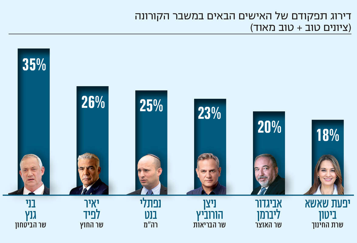 לכן, גם לא פלא שמסקר "ישראל היום" עולה כי את הציונים והדירוגים הנמוכים ביותר לתפקוד במשבר הקורונה נותן הציבור לשרת החינוך, שאשא ביטון (רק 18% דירגו אותה בציונים טוב וטוב מאוד), לשר האוצר ליברמן (רק 20%), ואחריהם: שר הבריאות ניצן הורוביץ (23%), ראש הממשלה נפתלי בנט (25%), יאיר לפיד (26%), ובני גנץ עם 35% שדירגו אותו בציונים טוב וטוב מאוד.