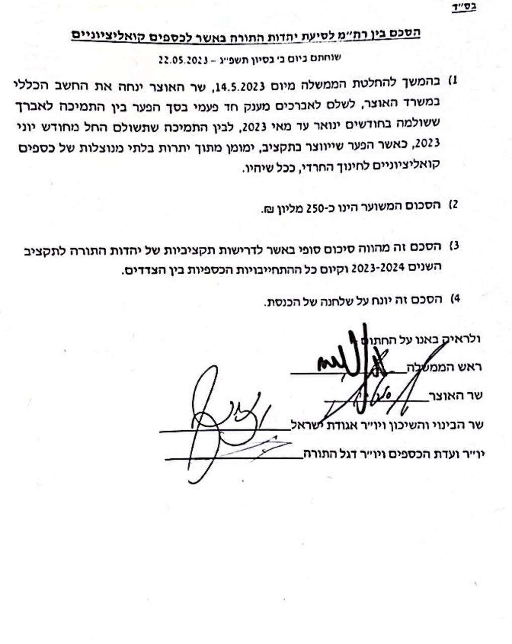 כזכור, יהדות התורה מחולקת לדגל התורה הליטאית ולאגודת התורה החסידית. מי שניהל את המו"מ היו החסידים. ל"ישראל היום" נודע שבמהלך השיחה הבוקר שבה היו נוכחים נתניהו, סמוטריץ' ואמסלם, העלו על הקו את גפני וביקשו את אישורו להסכם הנוכחי, שכן 250 מיליון השקלים הללו הם מתוך התקציב שלו.