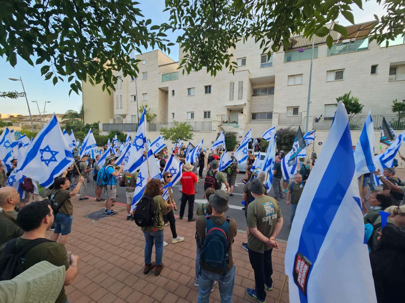 אנשי מחאת המילואימניקים אחים לנשק הגיעו הבוקר לביתו במודיעין של המשפטים יריב לוין, במחאה על הרפורמה.