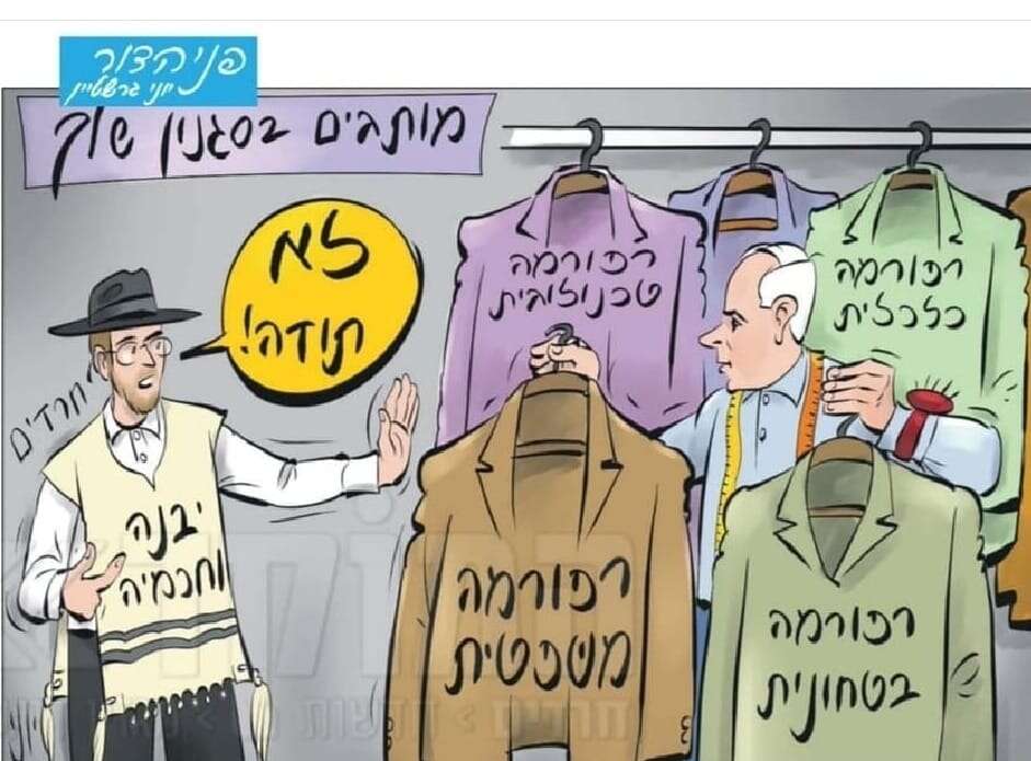 בקריקטורה של המאייר יוני גרשטיין נראה גבר חרדי נכנס לחנות "מותגים בסגנון שלך", ומשיב במילים "לא תודה" לחליפות שמציע המוכר ועליהן שמות של רפורמות: רפורמה ביטחונית, רפורמה משפטית, רפורמה טכנולוגית ורפורמה כלכלית.