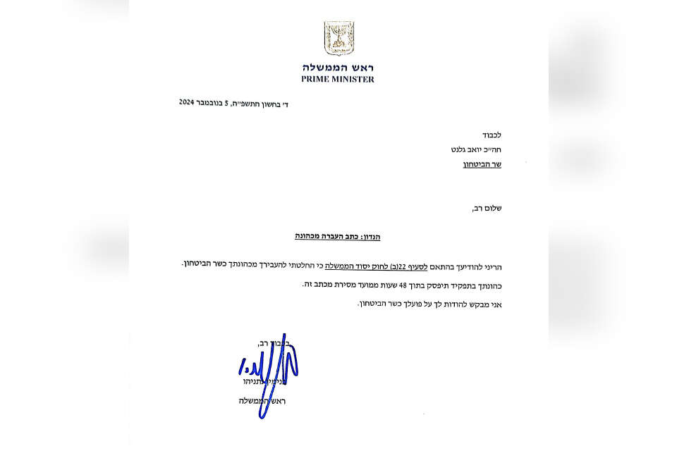 במכתב הפיטורין שנשלח מנתניהו לגלנט, נכתב: "החלטתי להעבירך מכהונתך כשר הביטחון. כהונתך תפסק בתוך 48 שעות ממועד מסירת מכתב זה. אני מבקש להודות לך על פועלך כשר הביטחון".