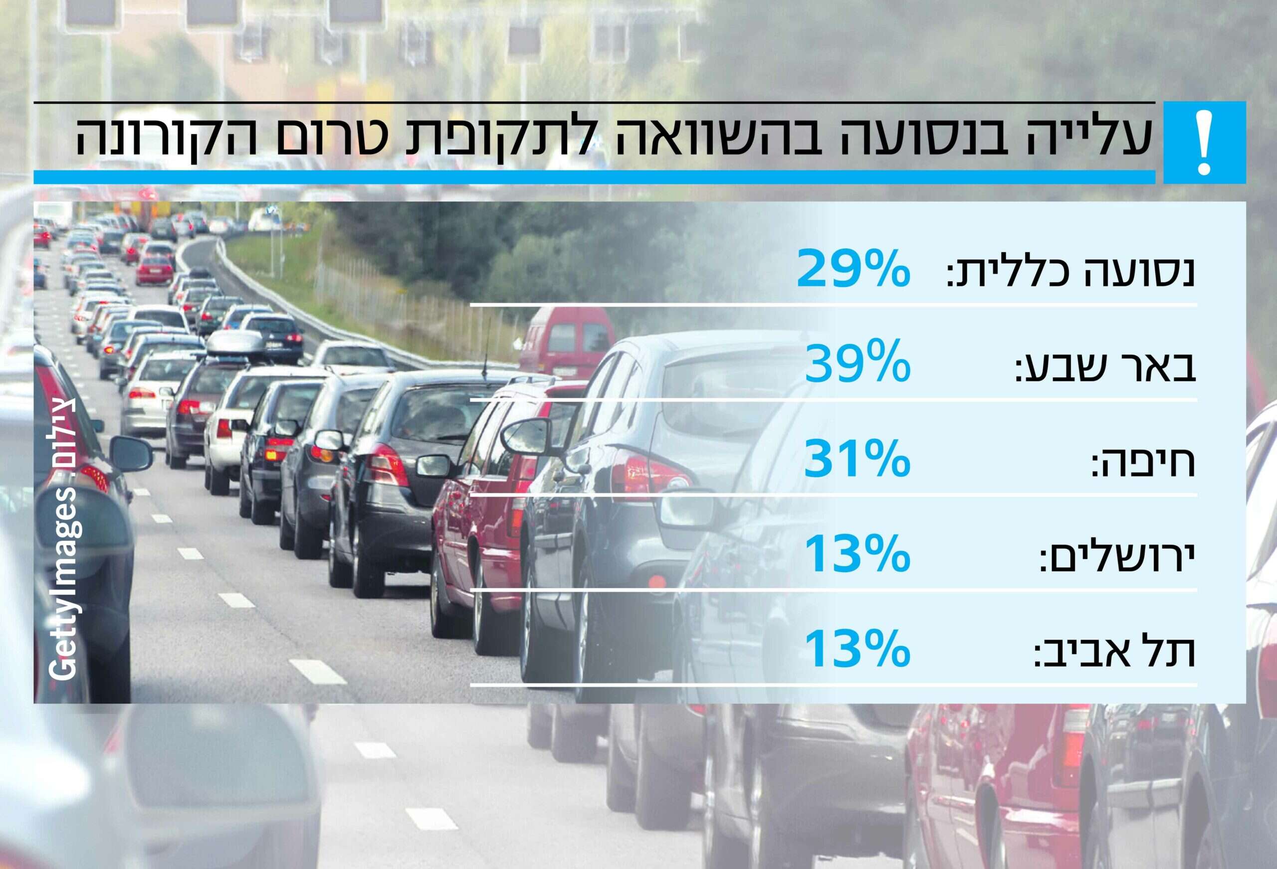 על פי נתוני ווייז מבדיקה שנערכה עבור "ישראל היום״, ישנה עלייה של קרוב ל־30% בנסועה בכלל חלקי הארץ, לעומת ימי טרום הקורונה. הנסועה היא מספר הקילומטרים הממוצע שהציבור נוסע ביום, וככל שהנסועה גבוהה יותר, המשמעות היא שנסענו יותר והיו פקקים רבים יותר.