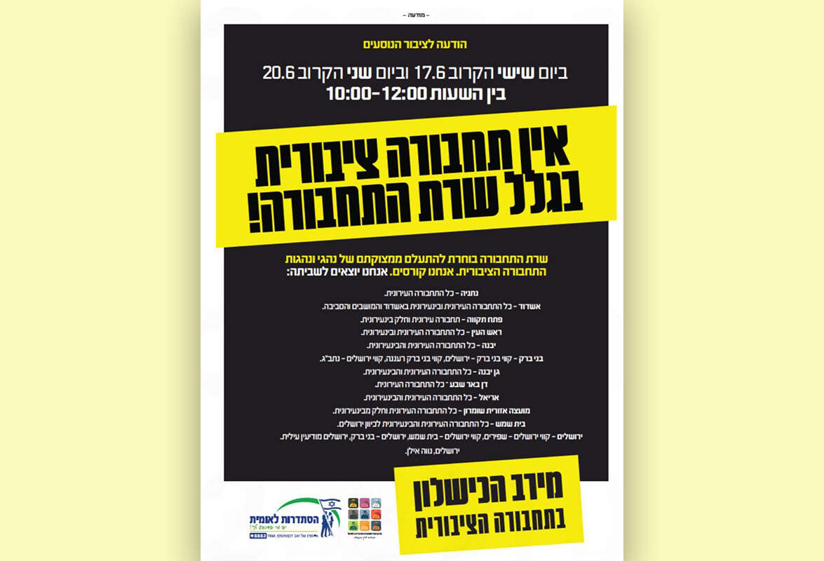 אלפי נהגי אוטובוס של חברות שונות ישבתו מחרתיים (שישי) וביום שני הקרוב בין השעות 12:00-10:00, שעות השיא של התחבורה הציבורית, במחאה נגד שרת התחבורה מרב מיכאלי, שלטענתם לא מוכנה להיפגש איתם על מנת לדון על שיפור שכרם ועל הדרך שבה ניתן יהיה לדאוג לביטחונם ולרווחתם.