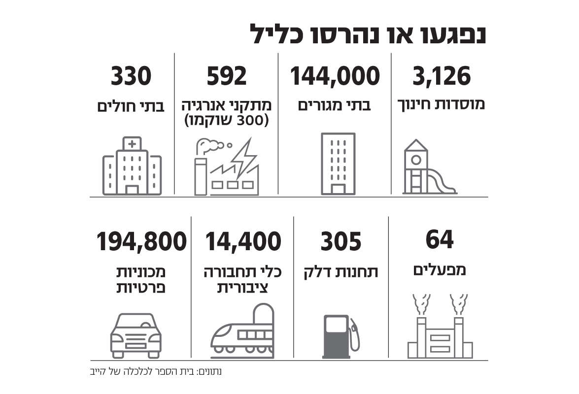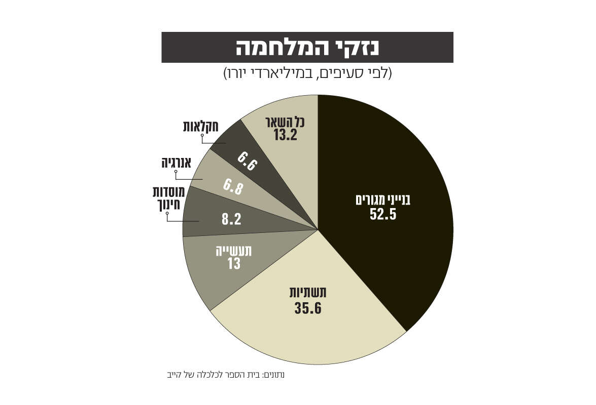 ממה מורכב הנזק הזה? באוניברסיטה הכלכלית של קייב אומדים את עלות הרכוש שניזוק ב־135.9 מיליארד דולר. עיקר הנזק נגרם למגורים: כ־126 אלף בתים פרטיים נפגעו או נהרסו, ולצידם כ־17 אלף בנייני מגורים. כ־195 אלף מכוניות פרטיות נהרסו, וכך גם 14,400 כלי תחבורה ציבורית (ראו פירוט באינפוגרפיקה).