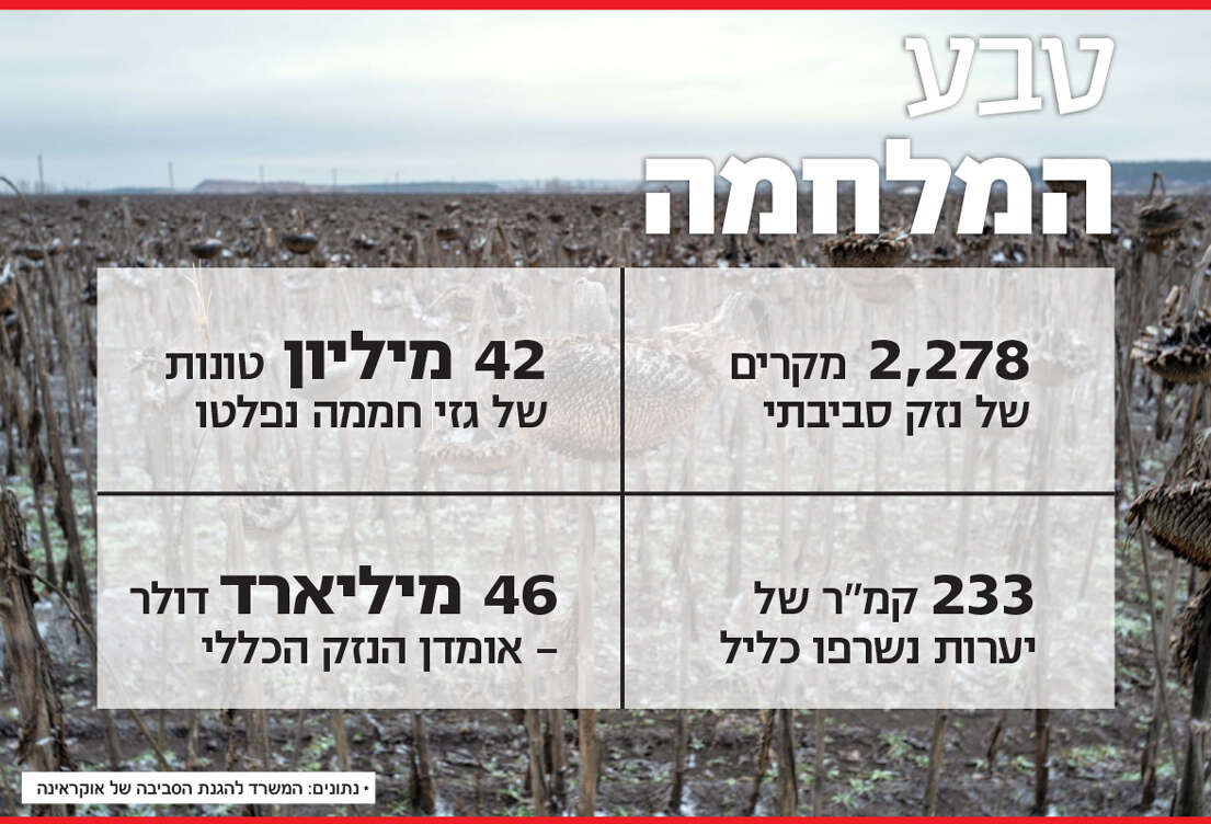 אם כבר עוסקים במונחים כלכליים, הנזק הגדול מכל מתבטא בזיהום האוויר. הסיבה: שריפות יער והפצצות של תשתיות האנרגיה. בקייב מעריכים כי עד כה נשרפו בהפצצות 680 אלף טונות של נפט ומוצריו. "רק בתשעת החודשים הראשונים לפלישה נפלטו לאוויר כ־42 מיליון טונות של גזי חממה", אמר השר להגנת הסביבה, רוסלן סטרילץ. "אפשר להשוות זאת לסך הפליטות של מדינה כמו בולגריה". אוקראינה כבר הבהירה שבתום המלחמה, תדרוש מרוסיה פיצויים גם בגין הנזקים האקולוגיים.