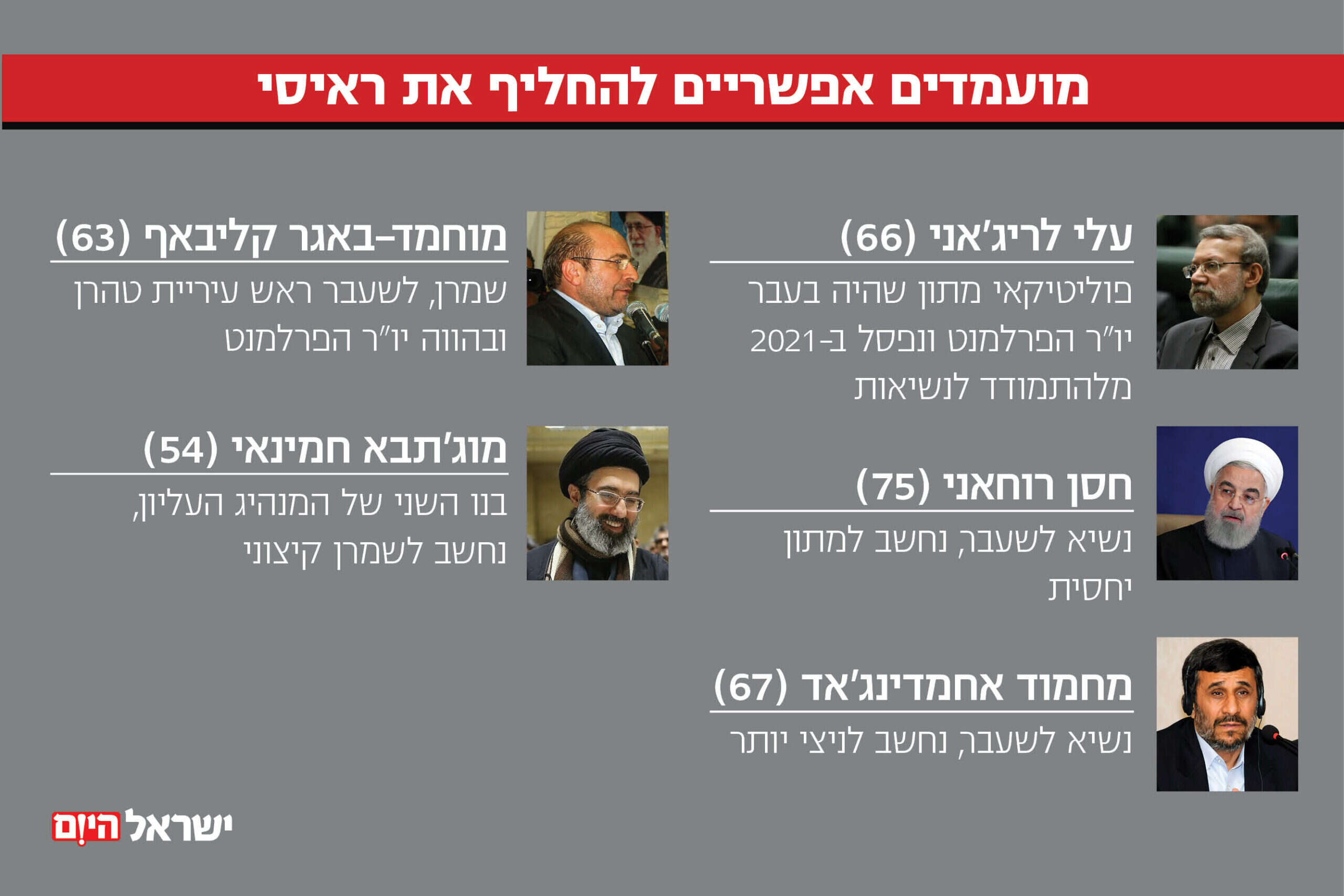 מי יחליף את ראיסי, שהיה מקורב מאוד למנהיג העליון עלי חמינאי? לכאורה, השמות האפשריים מוכרים: עלי לריג'אני (66), פוליטיקאי מתון שהיה בעבר יו"ר הפרלמנט ונפסל ב-2021 מלהתמודד לנשיאות; הנשיאים לשעבר חסן רוחאני (75) המתון יותר, ומחמוד אחמדינג'אד (66), הניצי יותר; ומוחמד-באגר קליבאף (63) השמרן, לשעבר ראש עיריית טהרן ובהווה יו"ר הפרלמנט.