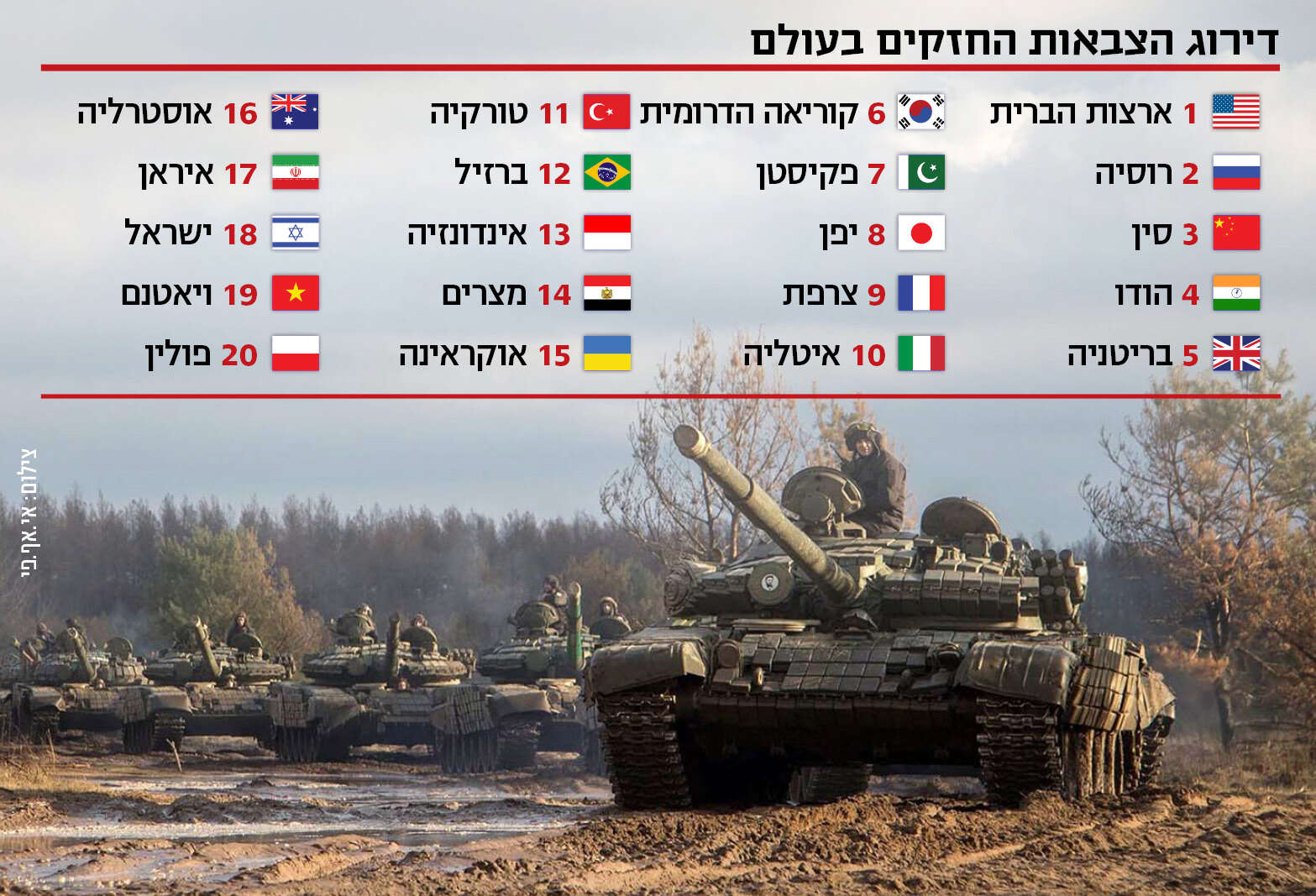 את הדירוג מובילה ארה"ב ואחריה רוסיה, סין, הודו ובריטניה, כאשר בתחתית נמצאת ממלכת בהוטן במקום ה-145 והאחרון.מנגד, בדירוג אשר פורסם בשבוע האחרון מטעם US News ו-World Report, ישראל נמצאת בתוך 10 המדינות בעלות הצבא החזק ביותר בעולם, בזמן שציינו כי "למדינה היהודית בריתות בינלאומיות מהחזקות ביותר".