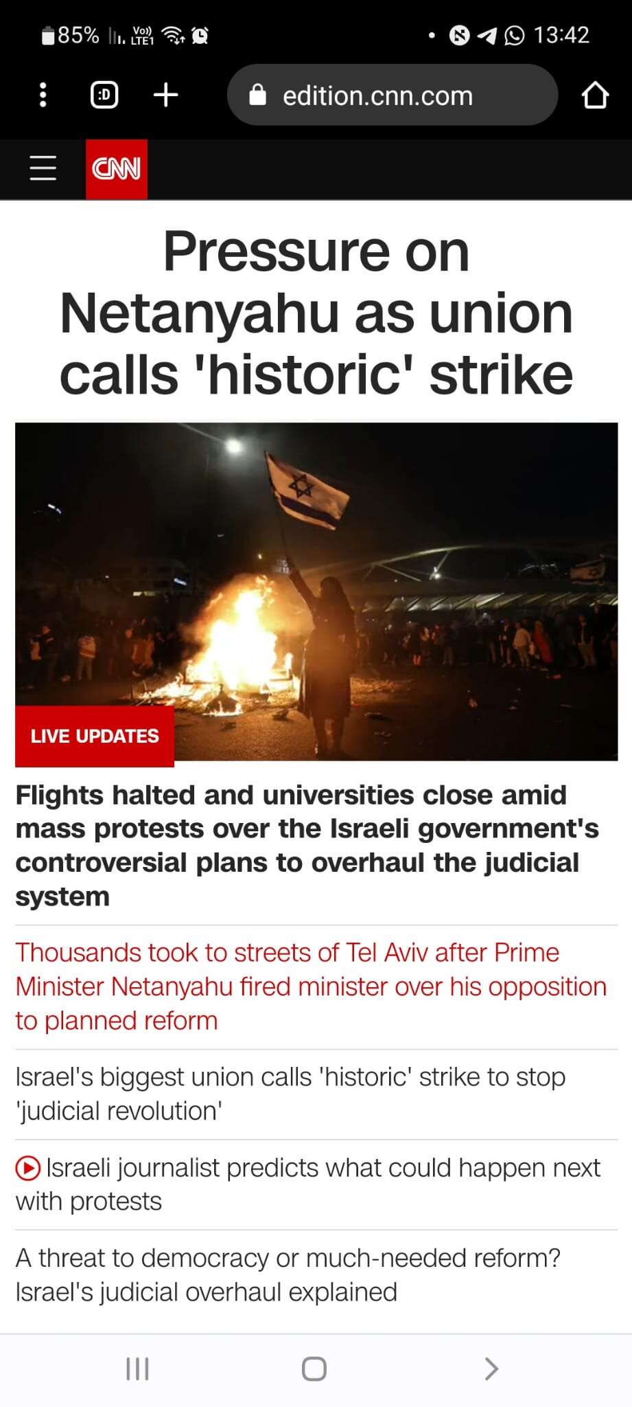 CNN, רשת החדשות הגדולה בעולם, הקדישה את ראש עמוד הבית שלה למחאה בישראל והגישה לקוראיה כתבות העוסקות בהפגנות המתוכננות ברחבי הארץ, דיווחה על ההצטרפות של ההסתדרות למחאה וכן הביאה את התגובות במערכת הפוליטית למשבר. נוסף על כך, צורף מאמר מקיף המסביר לציבור הקוראים את מהות הרפורמה המשפטית.