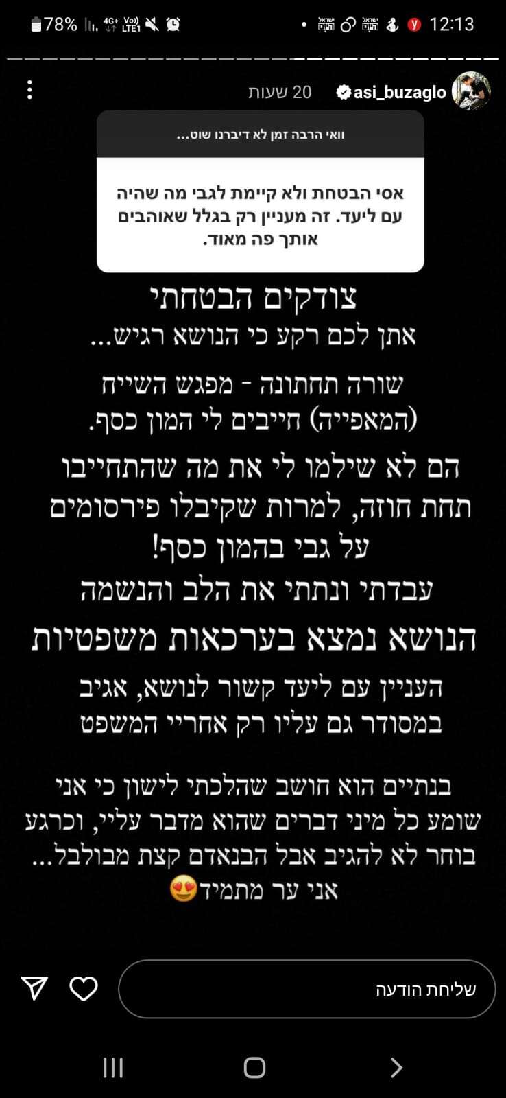מוקדם יותר בסטורי נוסף, לפני מספר שבועות, ציין מר בוזגלו: "אין לכם מושג כמה אני שמח שאני כבר לא חלק מהדבר הזה, יום אחד אספר לכם את כל האמת, ואתם תהיו בשוק!".