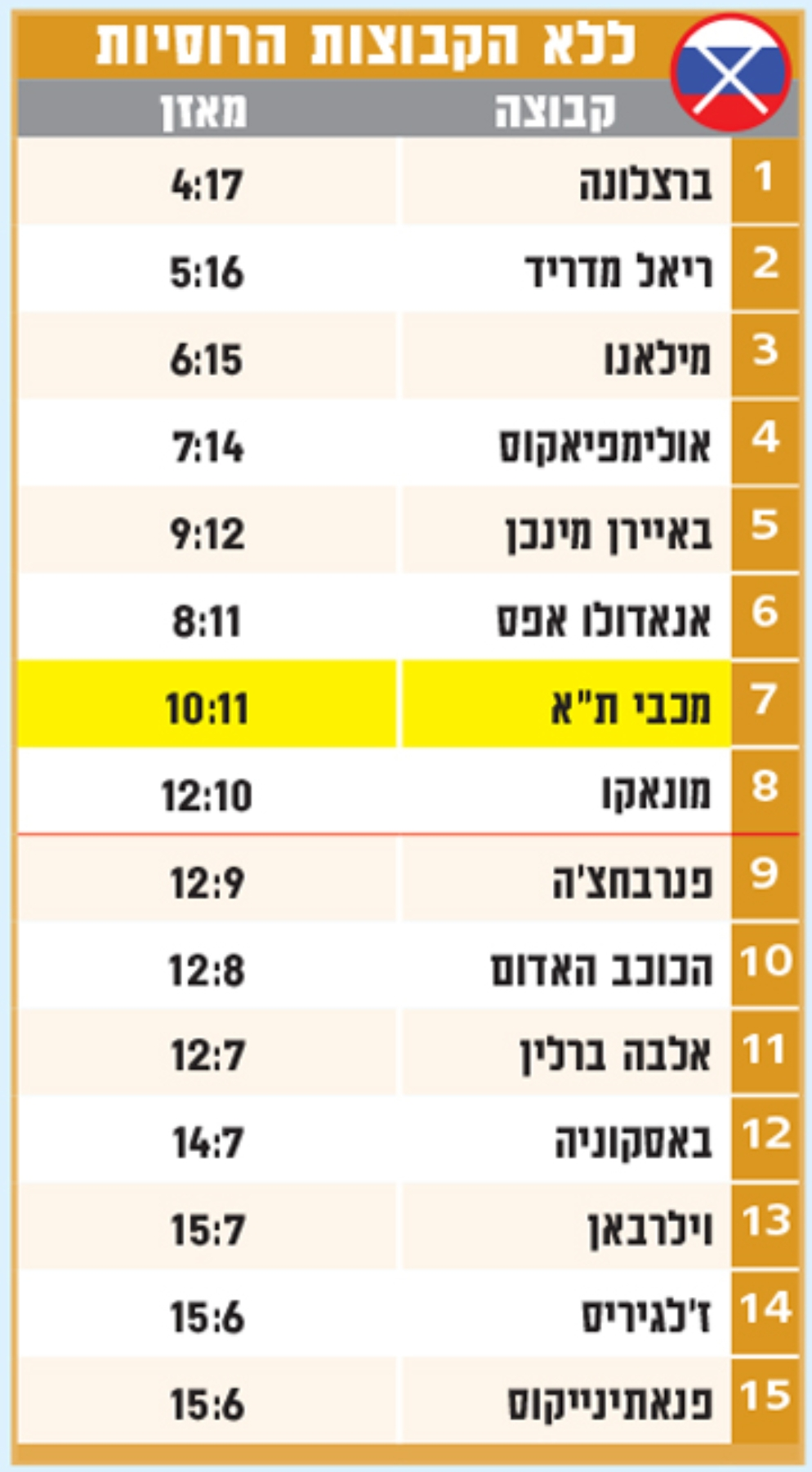 באיירן מינכן, שהפסידה בשלושת משחקיה לרוסיות, תוקפץ מהמקום ה־11 למקום החמישי(!), מכבי ת"א (מאזן 3:1 מול הרוסיות) תזנק למקום השביעי, והשיא: ז'לגיריס קובנה, נמושת היורוליג העונה (4:0) והאחרונה בטבלה, פתאום הרוויחה סיכוי תיאורטי לעלות לפלייאוף. לליטאים יש עוד שבעה משחקים (חמישה בבית ומשחק חוץ בוויטוריה, שבו הם בהחלט יכולים לנצח). בחסות "פוטין", פתאום הם מגלים שיש להם על מה להיאבק העונה.