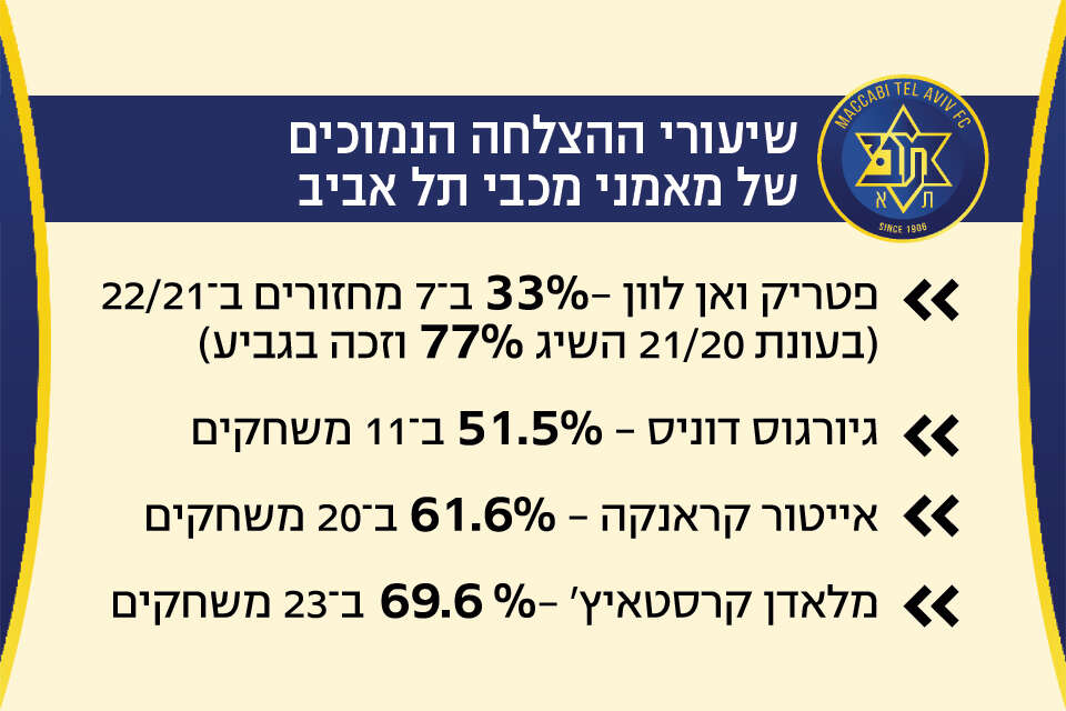 שימו לב לנתונים של כל מאמני מכבי שעמדו על הקווים בשלוש העונות האחרונות. אחרי שתי האליפויות הרצופות והמרשימות שהשיג ולאדן איביץ', הגיע למכבי המאמן היווני גיורגוס דוניס, שפוטר אחרי 11 מחזורים בלבד, עם שיעורי הצלחה נמוכים מאוד שעמדו על 51.5% - הנמוך ביותר מקרב כל המאמנים הזרים בעידן מיטש גולדהאר.