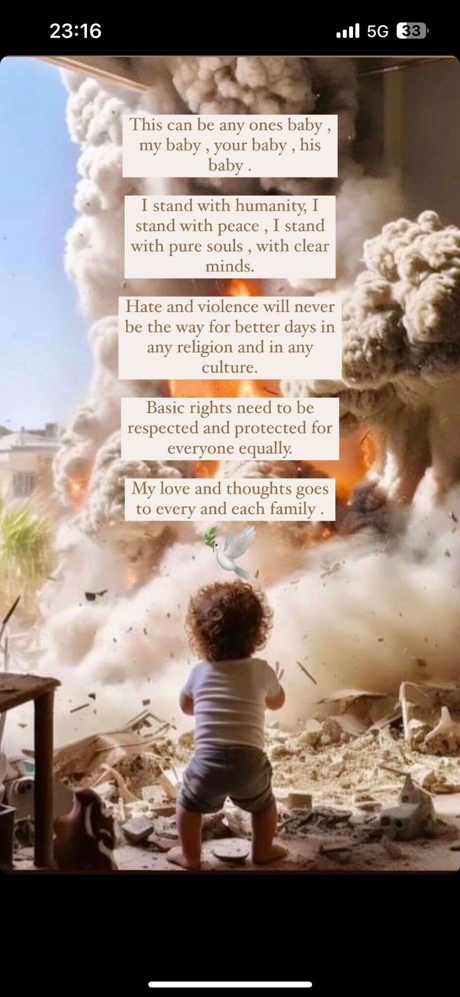 כיאל כזכור שיתפה תמונה מהרס הבתים בעזה בה רואים ילד קטן וכתבה -"זה יכול היה להיות התינוק של כל אחד מאיתנו. אני תומכת באנושיות".