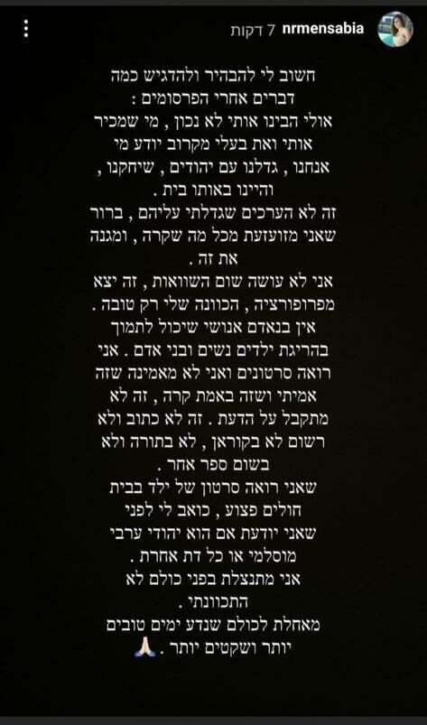 עוד לפני, נרמין כתבה: "חשוב לי להבהיר ולהדגיש כמה דברים אחרי הפרסומים. אולי הבינו אותי לא נכון, מי שמכיר אותי ואת בעלי מקרוב יודע מי אנחנו. גדלנו עם יהודים, שיחקנו והיינו באותו בית. זה לא הערכים שגדלתי עליהם, ברור שאני מזועזעת מכל מה שקרה ומגנה את זה", כתבה.