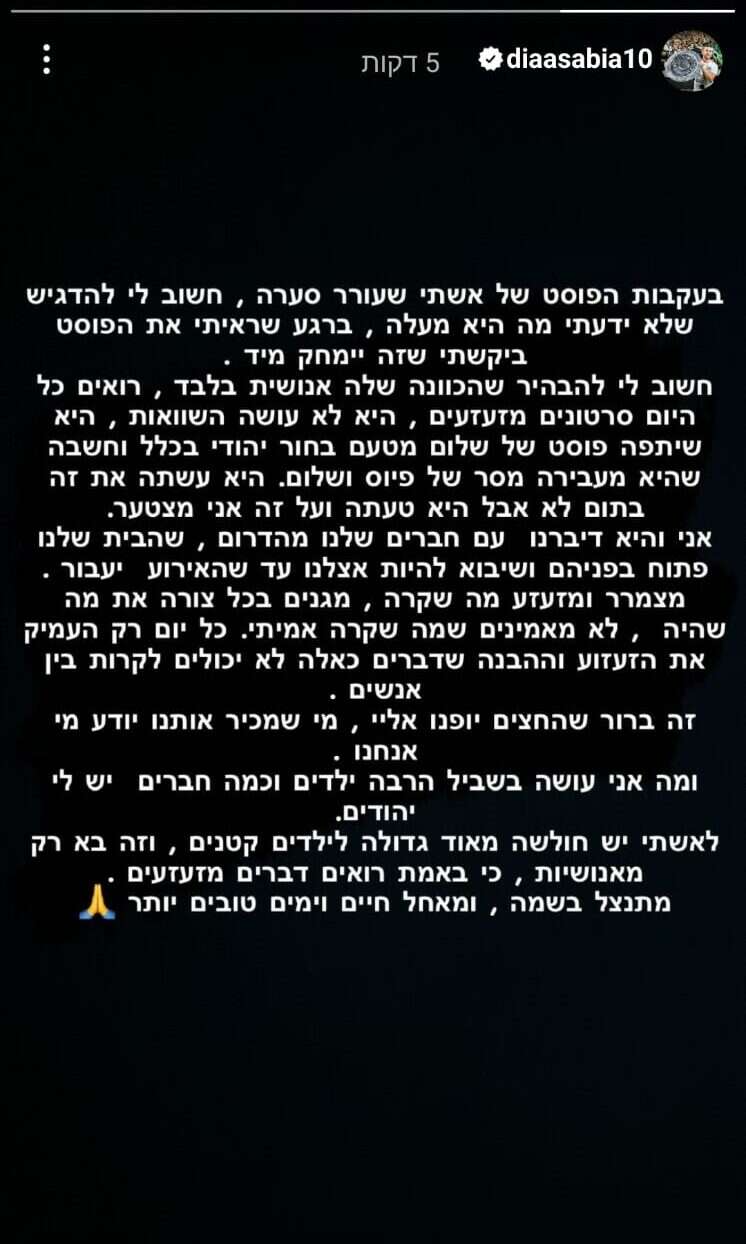 דיא סבע עצמו העלה סטורי באינסטגרם שבו כתב: "בעקבות הפוסט של אשתי שעורר סערה, חשוב לי להדגיש שלא ידעתי מה היא מעלה, ברגע שראיתי את הפוסט ביקשתי שזה ימחק מיד. חשוב לי להבהיר שהכוונה שלה אנושית בלבד, רואים כל היום סרטונים מזעזעים, היא לא עושה השוואות, היא שיתפה פוסט של שלום מטעם בחור יהודי בכלל וחשבה שהיא מעבירה מסר של פיוס ושלום".