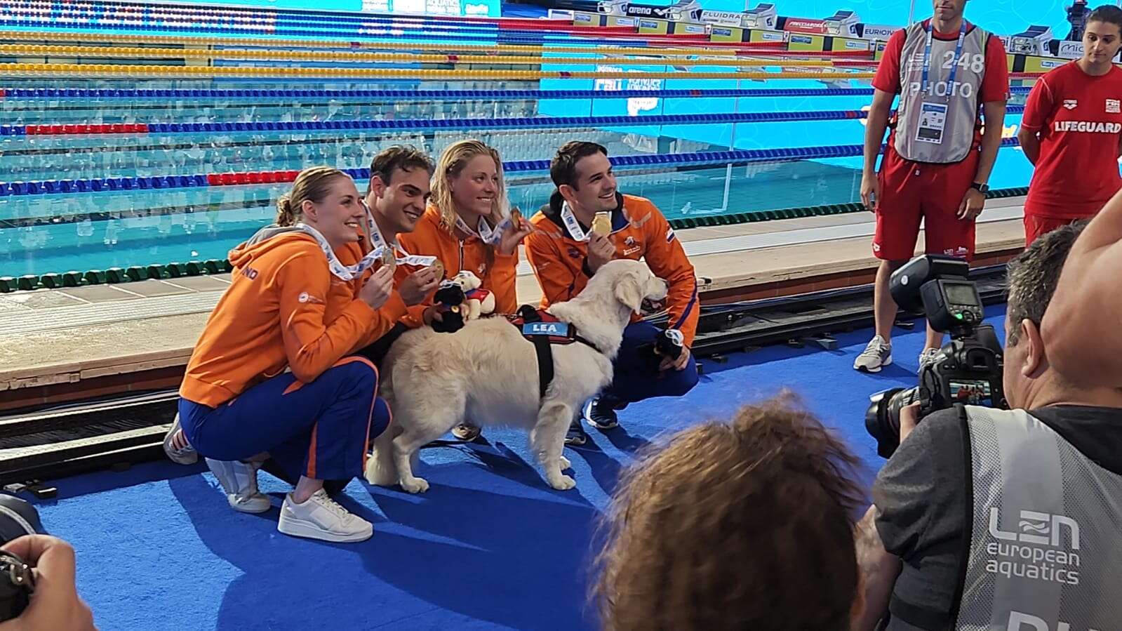 מי שצופה ביממה האחרונה באליפות אירופה בשחייה, הנערך בימים אלה ברומא, בוודאי יכול להבחין במהלך טקס חלוקת המדליות, כאשר כלבים משתתפים באירוע.