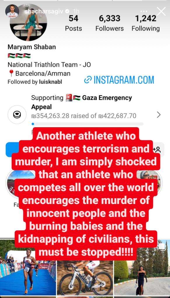 במצב בלתי נתפס, הטריאתלטית הירדנית מרים שבן, שחזרה רק לפני שבוע וחצי מאליפות אסיה בסין, החלה לעלות סטורים באינסטגרם התומכים בחמאס, העלתה סרטונים של הפגזות צה"ל בעזה ואף פתחה גיוס המונים כדי לגייס כסף לעזה, ועד כה אספה 320 אלף שקלים. אם זה לא מספיק, היא השתתפה מספר פעמים בהפגנות בירדן, כאשר היא התגאתה בתמונות ואספה אותם בהייליטס באינסטגרם שלה והוסיפה לפרופיל שלה מספר דגלי פלשתין.